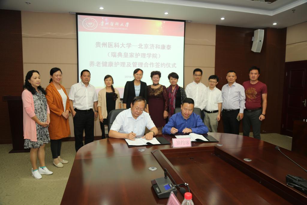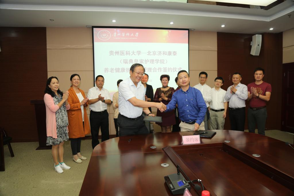9月1日下午2:30在北校区行政楼6楼连廊会议室,我校与北京济和康泰有限公司(瑞典皇家美加墨世界杯官方网站)举行了养老健康护理与管理合作签约仪式。党委副书记、附属医院党委书记刘兴德,贵阳市卫计委副主任洪阳及对外合作处处长余美娣,北京济和康泰有限公司总经理姚沂一行,我校有关部门领导、美加墨世界杯官方网站教职工参加了签约仪式。仪式由国际交流合作处处长付启宏主持。