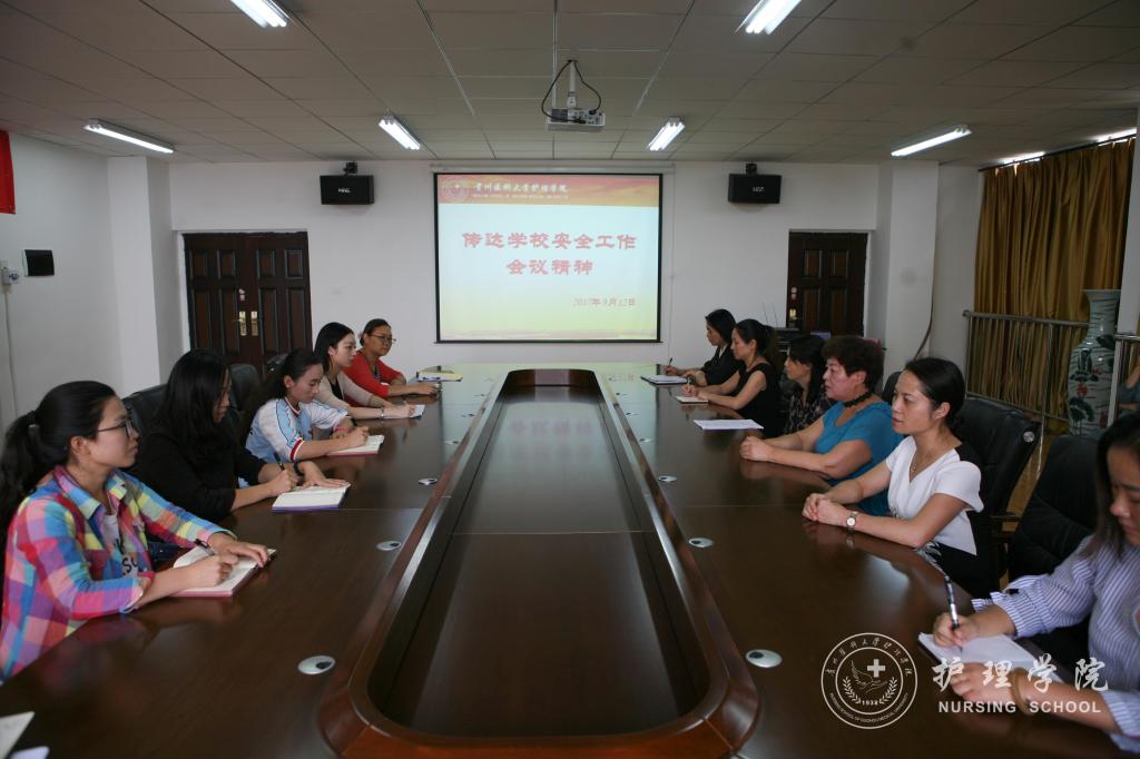 9月12日下午,世界杯官网召开安全稳定工作部署会,副书记杨英传达了学校安全稳定工作部署会精神以及校党委书记林昌虎、党委副书记战勇和副校长冉江舟的讲话内容,世界杯官网党委书记、院长贾秀英主持会议,党政领导班子和全院教师参会。