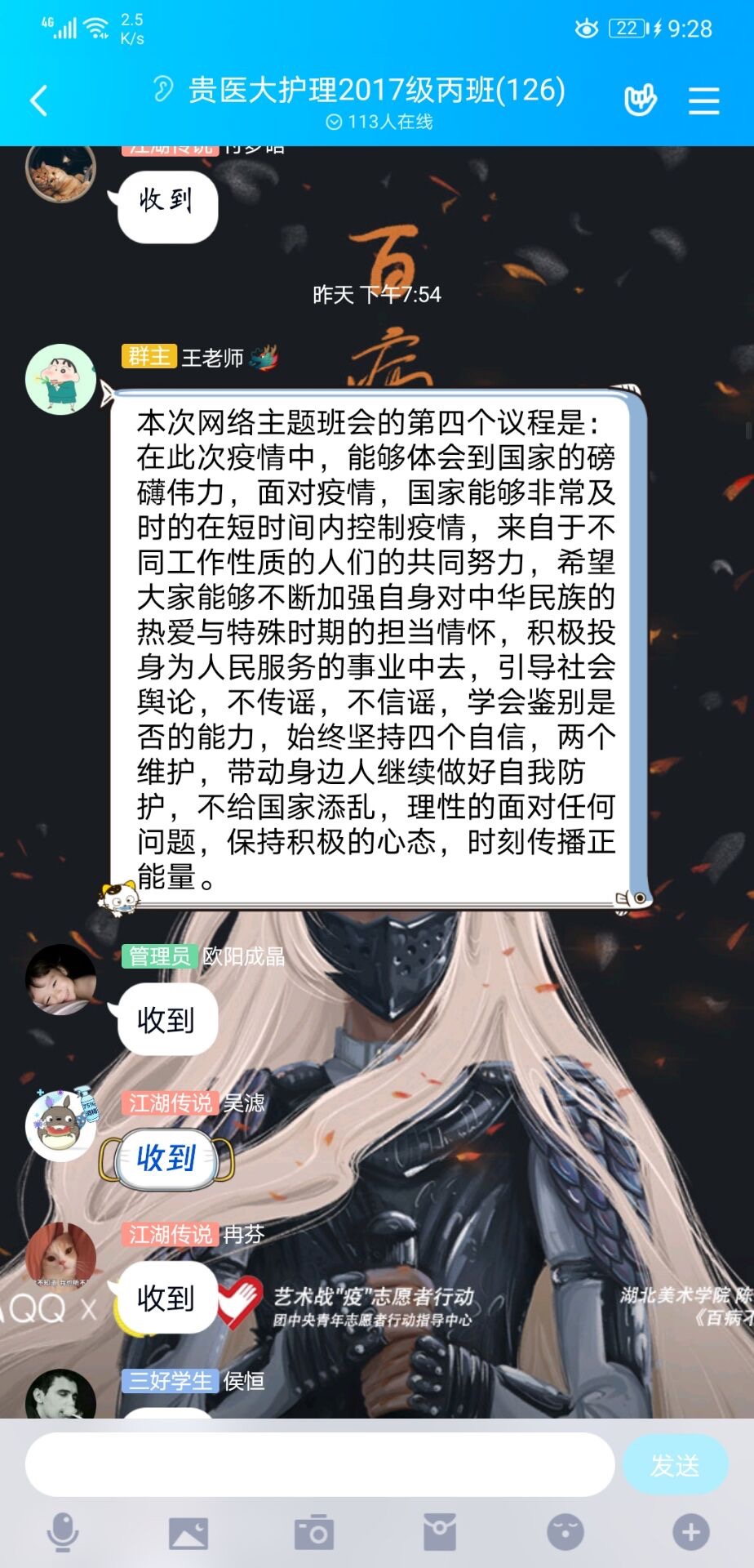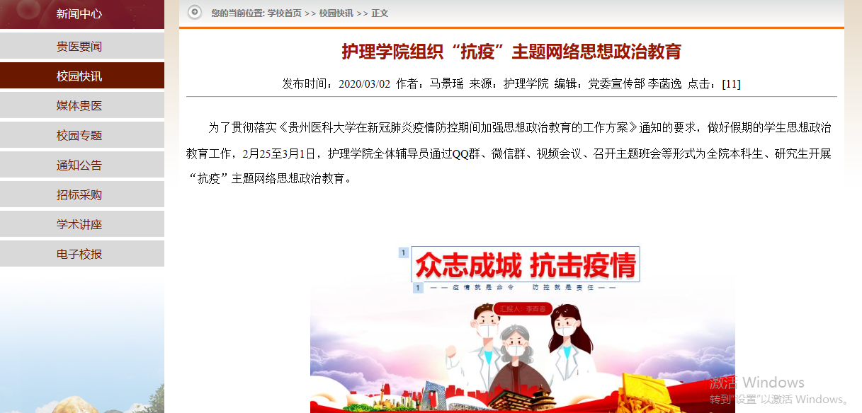 在学校和学院的领导和指导下,辅导员们立足本职工作,情系学生安危,充分利用互联网筑起与学生之间保持信息畅通的桥梁,及时为学生送去温暖:排查并重点关注湖北籍、有湖北旅居史学生;每日组织学生通过“今日校园”APP打卡的方式了解学生现居地和身体健康状况;对疫情严重地区学生进行心理辅导;上报疫情期间学生相关数据;协调毕业生实习就业相关事宜;召开网络视频班会传达学校的教学和管理规定、进行网络思想政治教育;心系毕业生就业工作,制作毕业生就业宣传推文,召开毕业生实习管理暨就业指导主题班会;积极组织撰写宣传、科普推文,通过“贵医护院”微信公众号普及新型冠状病毒肺炎防控知识,全方位引导学生正确对待疫情,做到不信谣、不传谣、自觉居家;学院团委积极组织开辟“贵医护理校友抗疫先进事迹”系列报道及 “南丁格尔志愿者抗疫行动”系列报道,宣传美加墨世界杯官方网站师生及校友抗疫事迹,传递正能量,帮助在校生正确认识护理专业,提升专业认同感的同时增加专业自豪感,树立投身医疗事业,为人民服务的远大志向。