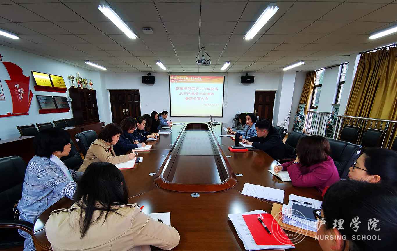 4月28日,为深入贯彻落实十九届中纪委五次全会和十二届省纪委五次全会精神,坚持“严”的主基调,发扬“实”的好作风。美加墨世界杯官方网站在南校区百川楼五楼会议室召开2021年全面从严治党暨党风廉政警示教育大会。美加墨世界杯官方网站党委书记杨英、党委副书记何为、副院长刘志燕、副科级以上干部、各党支部书记及全体辅导员参会。杨英主持会议。