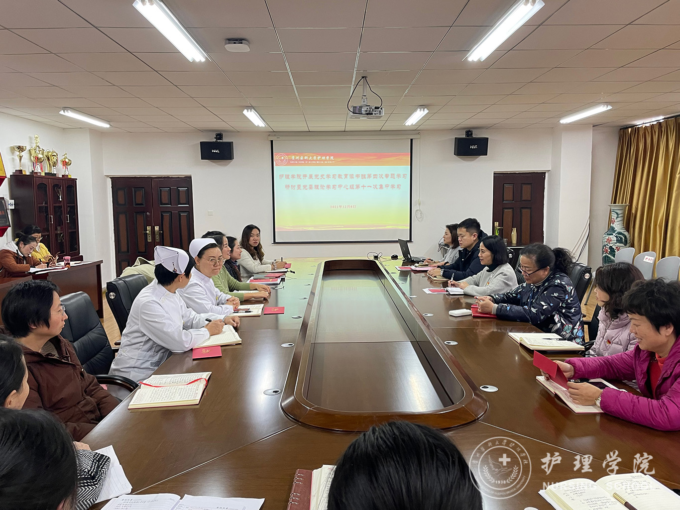 院领导班子成员分别结合自身工作实际围绕党的十九届六中全会精神,聚焦党的百年奋斗“五大历史意义”和“十条历史经验”,深刻把握“两个确立”,坚决做到“两个维护”进行交流研讨,党委书记杨英带头作中心研讨发言,其他班子成员依次作研讨发言;教职工党支部书记、正科级组织员作学习交流发言。