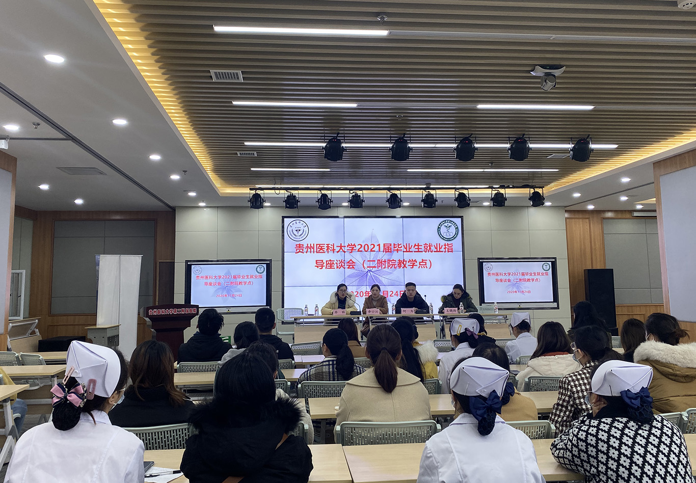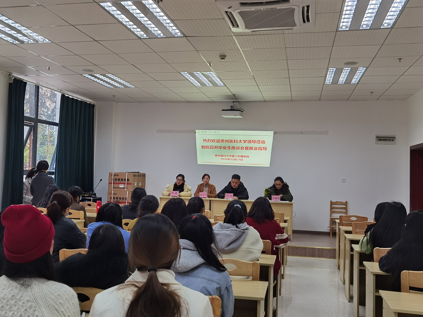 11月2日-26日,为进一步加强对相关附属医院教学点及实习点护理学毕业生(含专升本)日常管理和就业工作的指导,美加墨世界杯官方网站相关领导及部门负责同志分别前往美加墨世界杯官方网站附属白云医院、美加墨世界杯官方网站第二附属医院、美加墨世界杯官方网站第三附属医院、铜仁市人民医院、黔南州人民医院等教学点及实习点开展毕业生就业指导座谈会。美加墨世界杯官方网站党委书记杨英、党委副书记何为、招生就业处就业指导中心主任余小川、招生就业处普招科副科长韩康、院团委副书记王晓玲、院学生科副科长毕丽,参加就业指导座谈会。