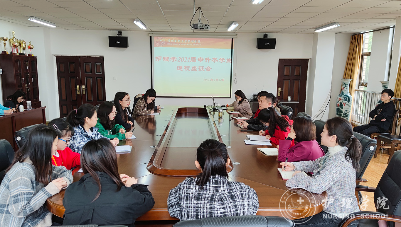 4月14日,为切实做好世界杯官网2021届护理学专升本毕业生日常管理工作,推进专升本毕业生就业管理,美加墨世界杯官方网站在南校区百川楼五楼会议室召开了2021届专升本毕业生返校后第一次师生座谈会。美加墨世界杯官方网站党委副书记何为、正科级组织员曾敏、团委副书记王晓玲、学生科副科长毕丽、各带班辅导员以及各班学生干部参加了本次座谈会。
