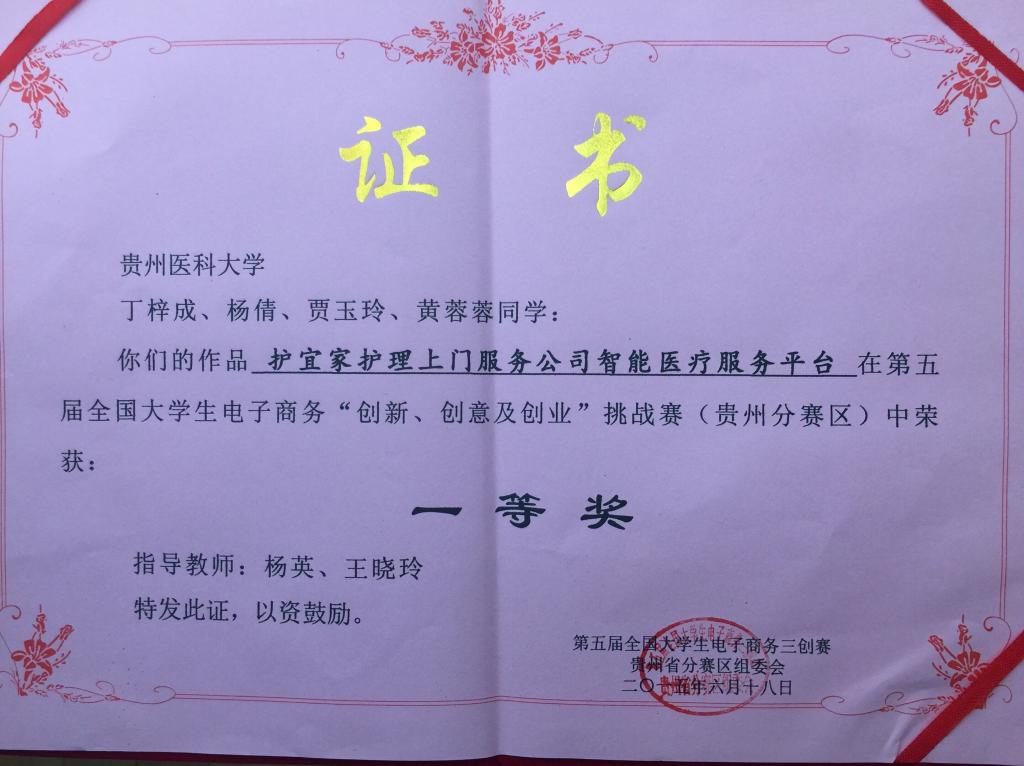 此次大赛共有来自全省各高校六十多支队伍参赛。在项目现场展示过程中,世界杯官网代表队向现场评委及同学进行了简短、精炼的介绍。随后,在答辩现场,世界杯官网学子以饱满自信的精神状态完成了PPT演示和现场答辩环节。经过评委们的认真评审,世界杯官网2012级贾玉玲、黄蓉蓉、杨倩、丁梓成同学的作品《护宜家护理上门服务公司智能医疗服务平台》荣获一等奖殊荣。