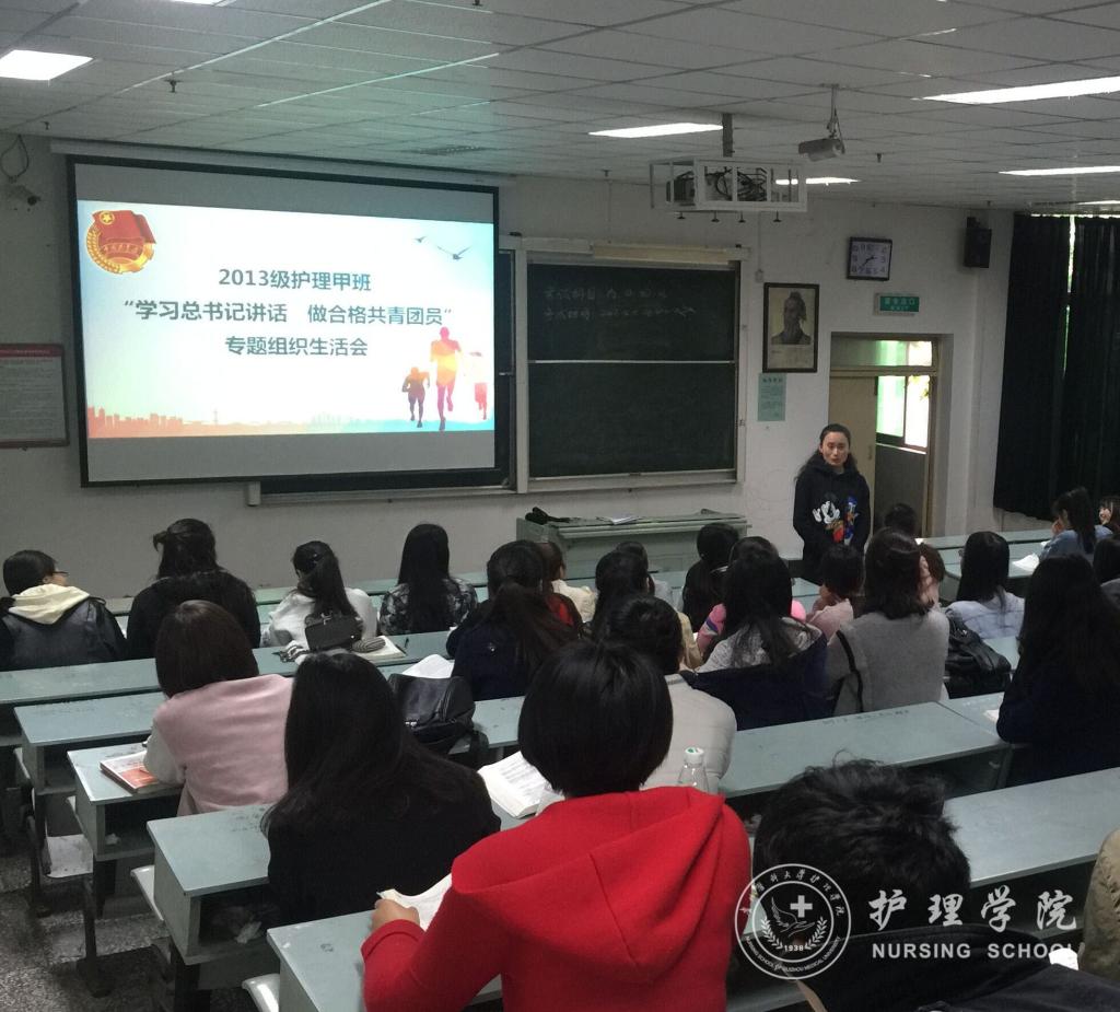 4月21日下午15时,美加墨世界杯官方网站在北校区3301教室举行了“学习习近平总书记重要讲话,做合格共青团员”专题组织生活会,参会的有美加墨世界杯官方网站分团委负责人王晓玲老师和2013级护理甲班全体同学。