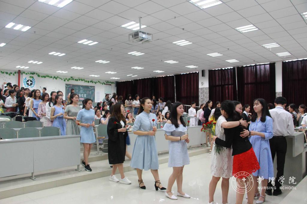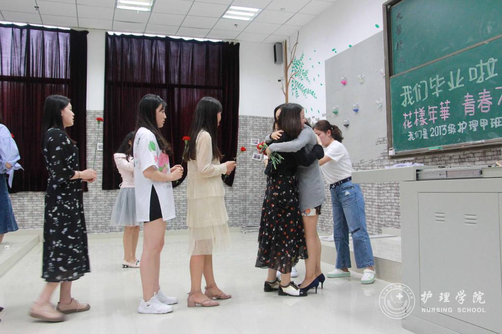接着,同学们在班委精心制作的视频中回忆了大学四年的花样时光,同学们争先上台有感而发,表达对老师关爱的感恩,对同学支持的感谢,对即将离别的不舍。之后,同学们纷纷向两位老师献上准备好的康乃馨,拥抱老师倾述师恩难忘,老师们笑中带泪,给每一位同学送上班徽,叮嘱同学们要带着大学生活这一段沉甸甸的美好回忆走出校园,不要忘记始终努力学习,始终坚持医务工作者的慎独与初心,用心工作,用心对待每一位病人,将贵医精神传承下去。