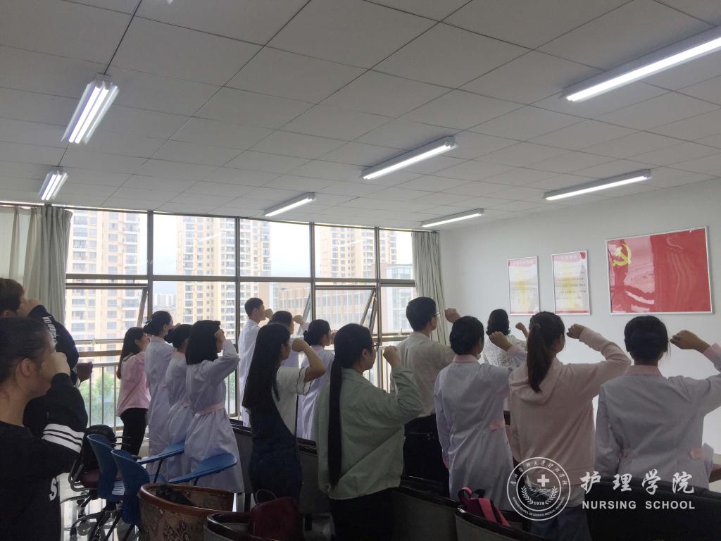 活动在庄严的《国际歌》中拉开了序幕,在辅导员马景瑶宣读美加墨世界杯官方网站2017年上半年新党员名单后,全体党员立正,面向党旗举起右手,在杨英副书记的带领下,面向党旗庄严宣誓:“我志愿加入中国共产党……随时准备为党和人民牺牲一切,永不叛党。”每个新党员都激动而又坚定地立下了自己一生无悔的誓言。接下来,2015级护理学甲班的夏啰啰同学代表新党员进行发言。他表示要以一名优秀党员的标准来严格要求自己,树立远大理想,牢记南丁格尔精神,学好专业知识,提升综合素质,努力为人民服务。