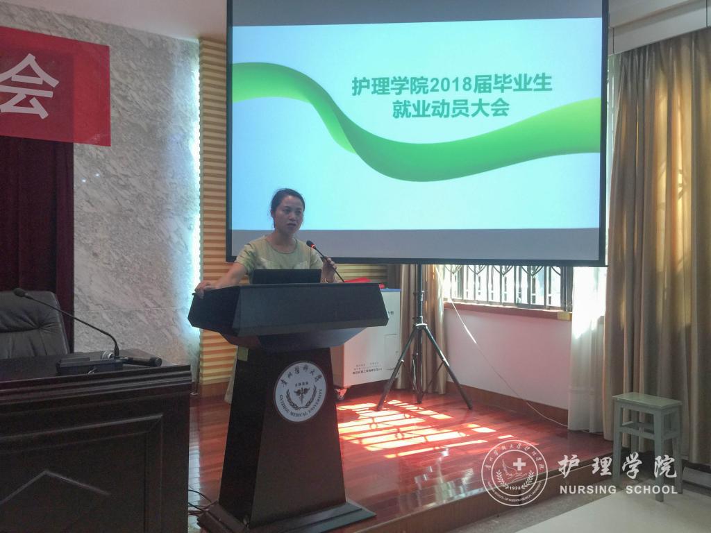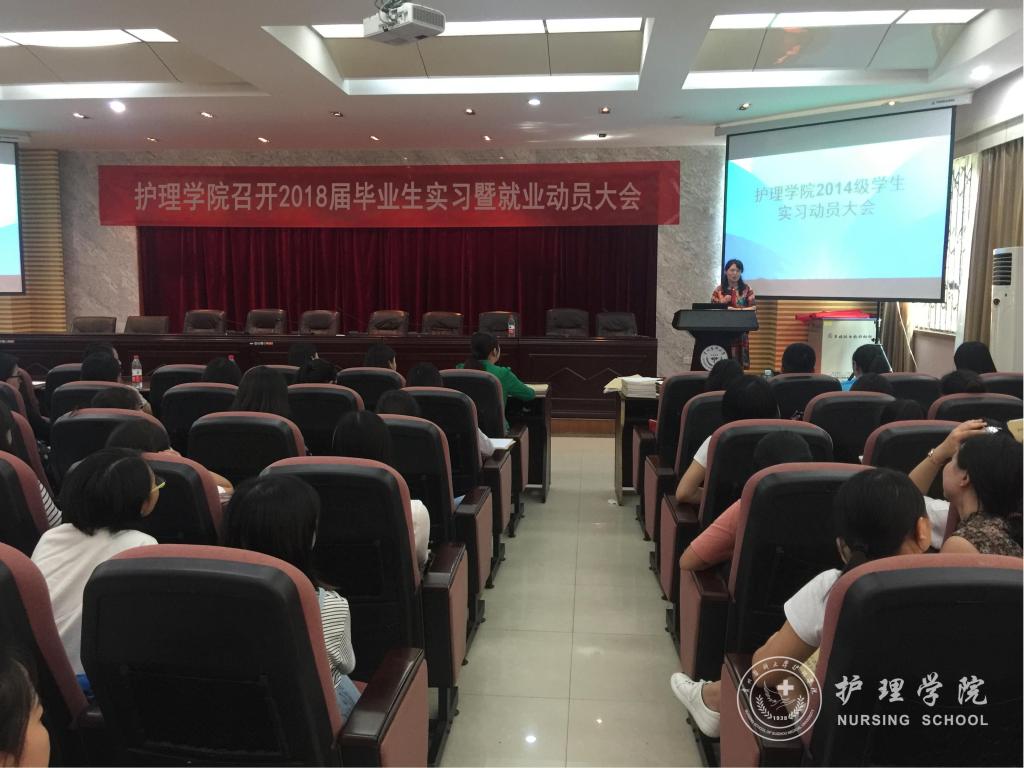 为帮助同学们更深刻地理解护理专业内涵、促进学生充分就业、保障2018届毕业生实习工作顺利开展。7月3日下午,美加墨世界杯官方网站在北校区道德讲堂召开美加墨世界杯官方网站2018届毕业生实习暨就业动员大会。美加墨世界杯官方网站党委副书记杨英、副院长刘志燕、学生科科长曾敏、生产实习科科长柳忠燕、优秀毕业生代表钱兰芳、杜伟、辅导员李颖及2014级全体同学参加了此次会议。会议由学生科科长曾敏主持。
