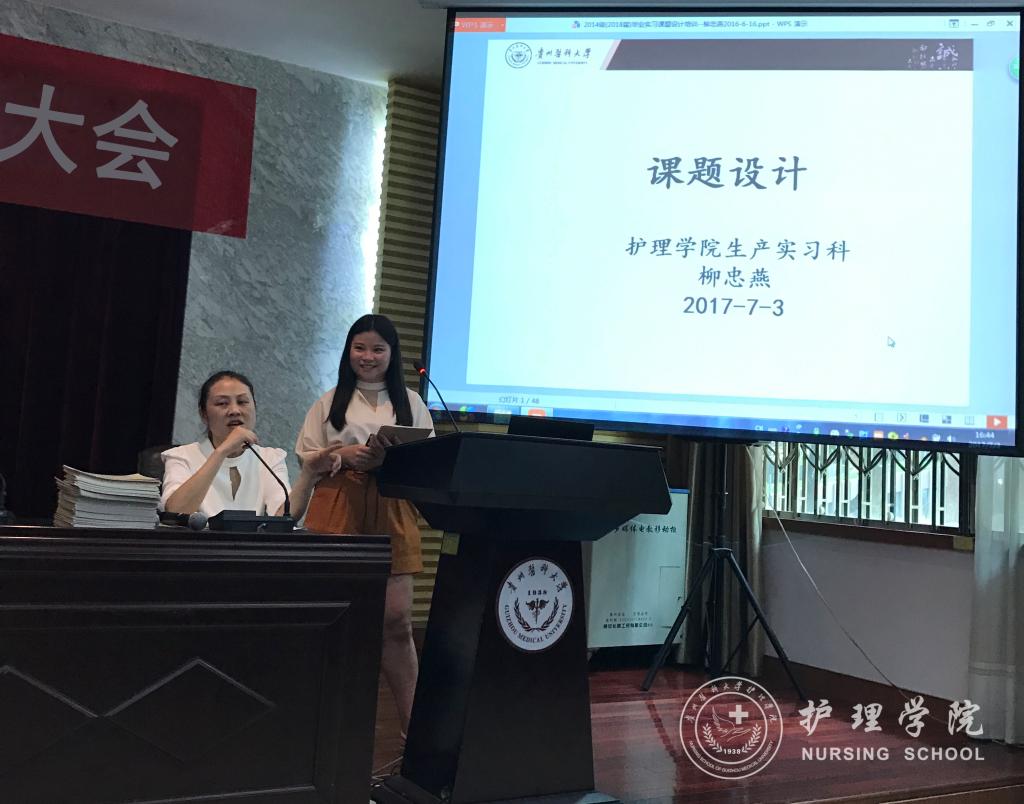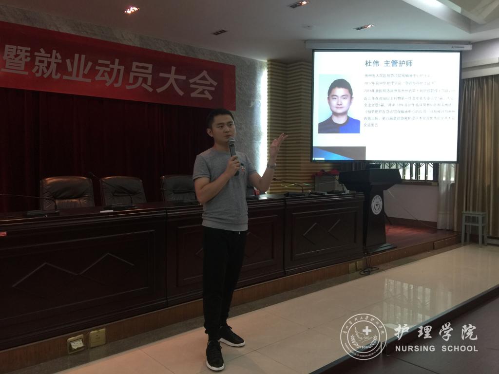 会议首先由世界杯官网优秀毕业生代表,荣获2017年贵州省护士岗位技能竞赛PICC护理专业一等奖的钱兰芳、贵州省人民医院急诊留观输液中心护士长杜伟作现身说法。他们用风趣幽默的开场,吸引了同学们的注意力。在和同学们讲述毕业实习经历之余,也分享了她们8年工作、生活中所获得的经验和对护理专业的思考。钱兰芳提醒学妹学弟在实习期间,要进一步明确护理专业内涵、培养良好的职业价值观念;杜伟则强调护理工作积累过程的重要性,鼓励学弟学妹们以身边的优秀护士作为榜样,不断学习和积累,学会成长。