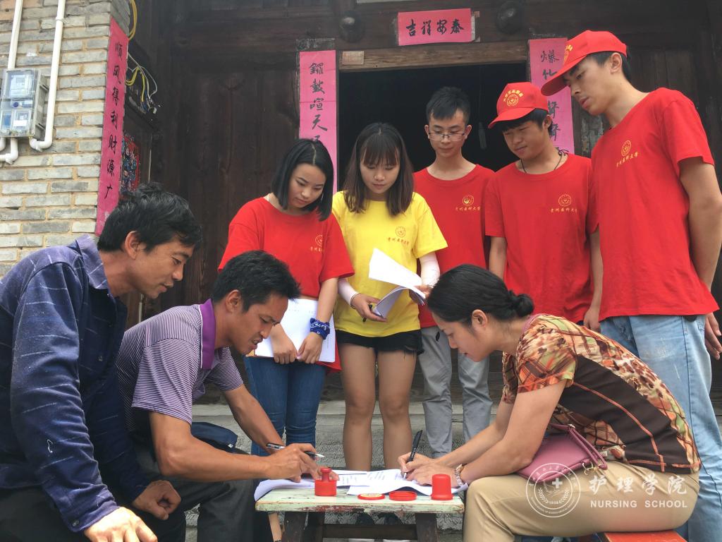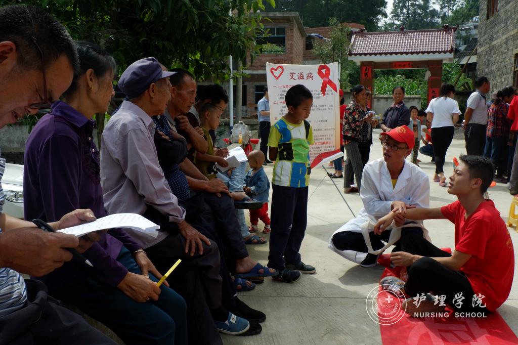 活动第一天上午9点,服务队到达贵定县昌明镇,杨英与当地政府签订了“共建大学生社会实践基地协议书”,随即,服务队在昌明镇分组开展了政策宣讲、乡情民情调研、发放常见病防治宣传单、常见病防治咨询、发放常用药品、为群众测量血压、预防艾滋病宣讲以及红十字急救培训八项服务。在服务过程中,同学们充分发挥自己的学科优势和专业技能,一方面从医学的角度向群众普及医学知识,以问卷调查的方式对当地居民展开乡情民情调研,了解当地医疗卫生现状以及居民对医学知识的了解程度。另一方面,同学们示范了常见外伤包扎方法,让更多的人在遇到危险时能够及时自救或帮助他人。同学们还针对艾滋病的传染源、传播途径以及易感人群三个方面向当地居民进行艾滋病知识的普及。