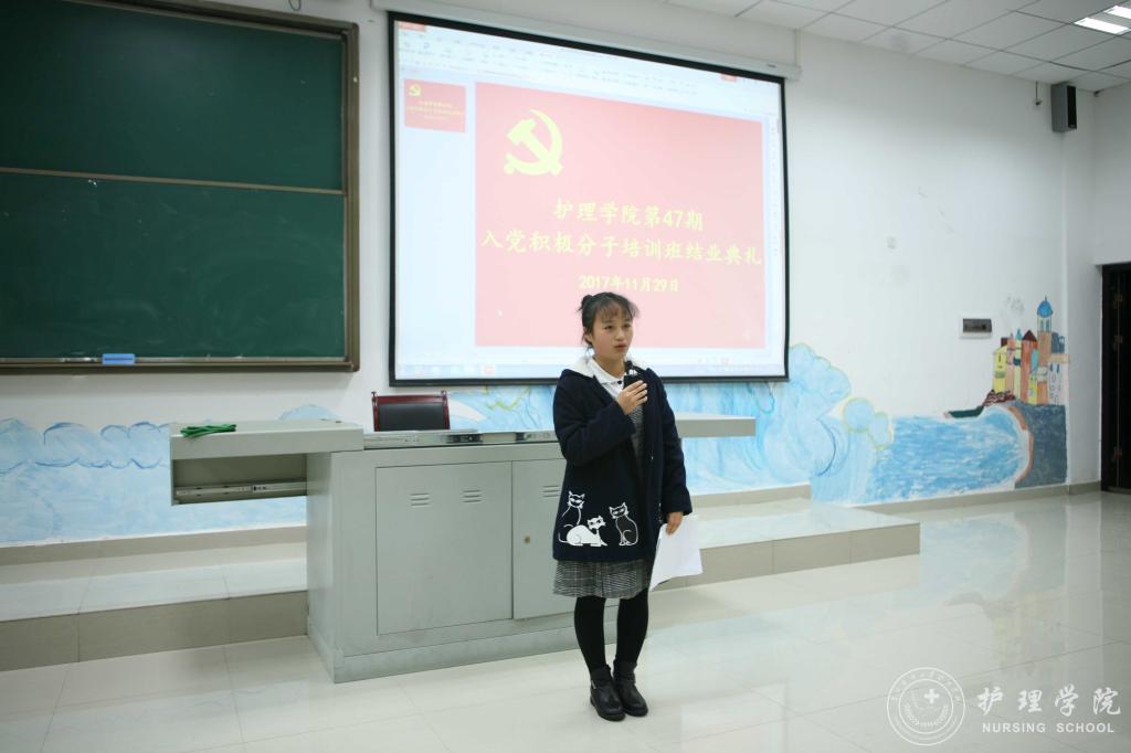 大会开始,全体起立,奏唱《国际歌》。接着,美加墨世界杯官方网站党委副书记杨英代表学院党委向顺利结业的全体学员表示热烈祝贺,向为本期培训班辛勤付出的老师们表示衷心的感谢!杨英指出,美加墨世界杯官方网站党委高度重视本期培训班的各项工作,经过老师和同学们的共同努力,圆满地完成了预定的培训任务。这次培训班课程安排合理,内容丰富,办得非常成功,有以下几点是值得肯定的:一是培训内容丰富,主题突出。二是培训方式多样,亮点突出。三是培训时间集中,效果突出。同时,杨英就同学们如何在实践中巩固和扩大培训成果,不断成长进步,提了几点希望:一是希望同学们继续加强理论学习,提升政治理论素养。二是希望同学们进一步明确人生目标,坚定理想信念。三是希望同学们进一步端正入党动机,主动接受党组织的教育和考验。四是希望同学们坚持学以致用,以实际行动争取早日入党。紧接着,2016级护理学乙班的程娅同学代表优秀学员进行交流发言,分享了自己的学习收获,并代表本期入党积极分子对自己的思想、学习等方面提出了新的目标和更高的要求。最后,美加墨世界杯官方网站学生党支部副书记马景瑶宣读了学院对14名优秀学员的表彰决定,美加墨世界杯官方网站党委副书记杨英为优秀学员颁发了荣誉证书,并合影留念。