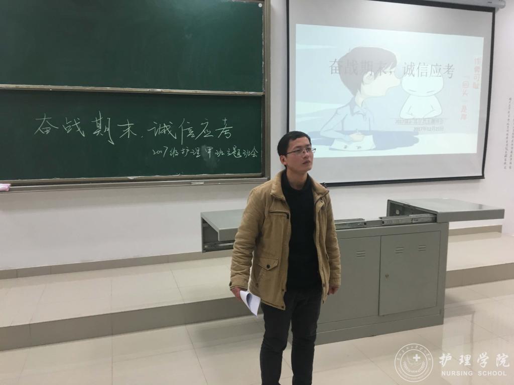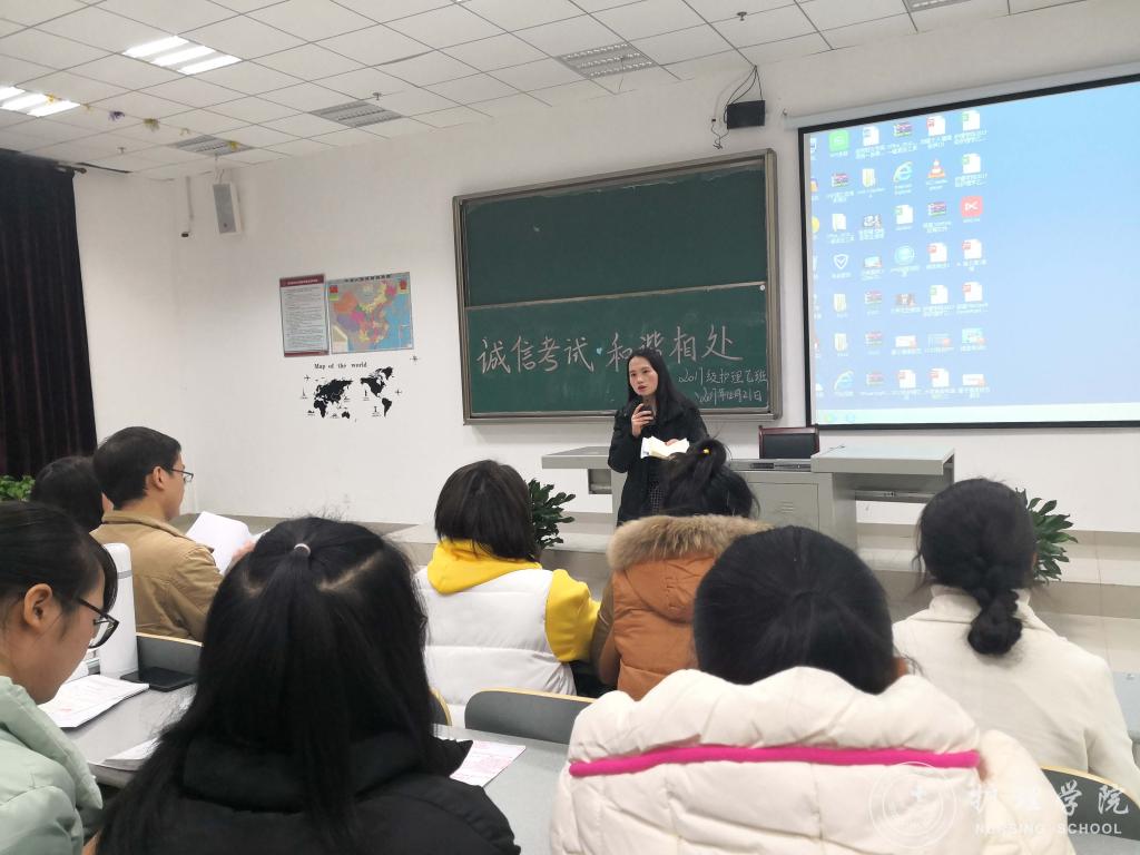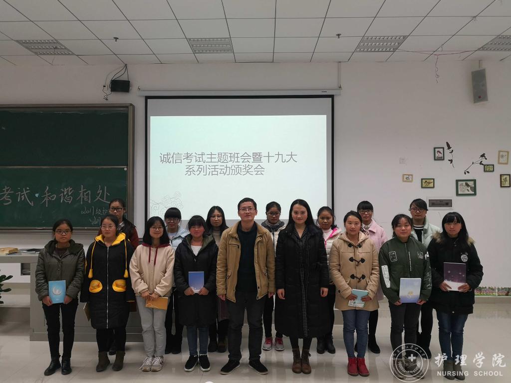 12月21日晚,美加墨世界杯官方网站在南校区7404和7406教室开展诚信考试主题班会暨十九大系列活动颁奖仪式。此次班会由班主任吴俊、王丽,辅导员马景瑶和班级学习委员主讲,2017级护理甲班、乙班全体同学参加,班会由各班班长主持。