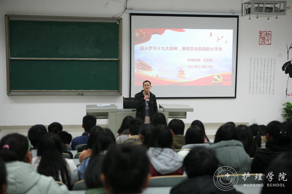 2017年12月29日晚上,学校优秀辅导员宣讲团成员、美加墨世界杯官方网站2017级新生辅导员马景瑶在南校区7406教室为美加墨世界杯官方网站2017级新生作题为“深入学习十九大精神,做有文化自信的大学生”的宣讲报告。