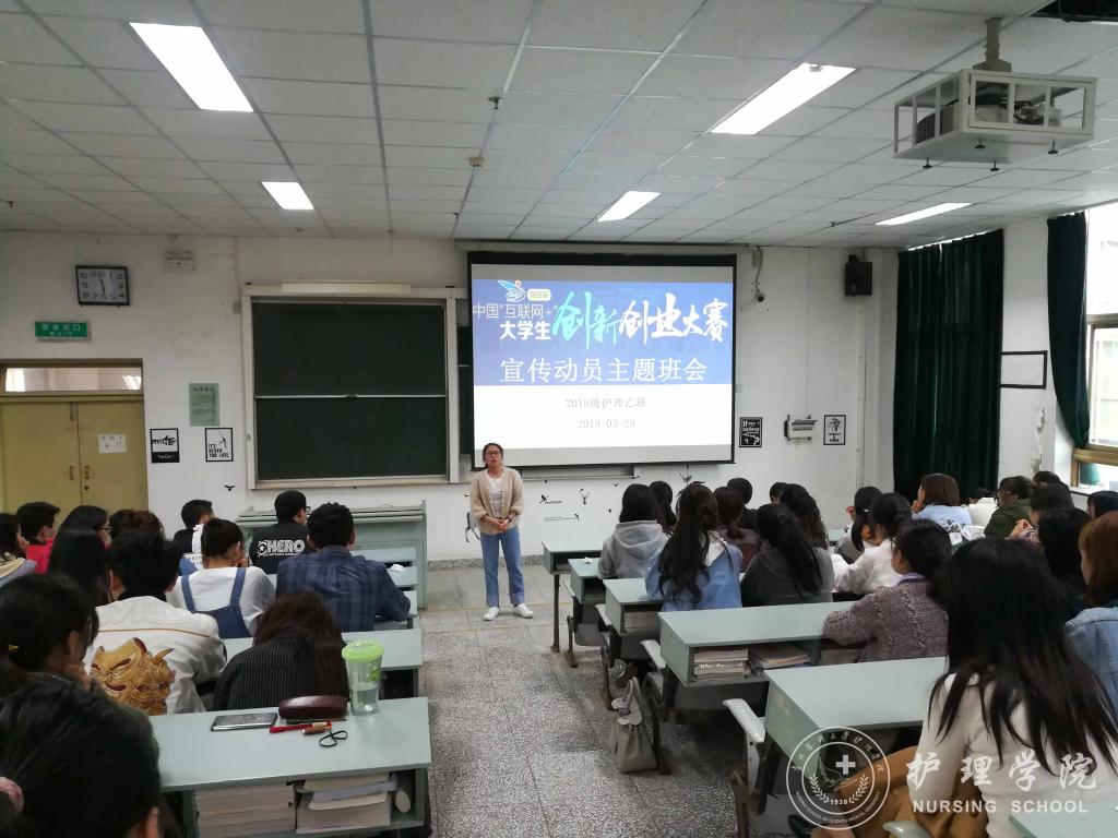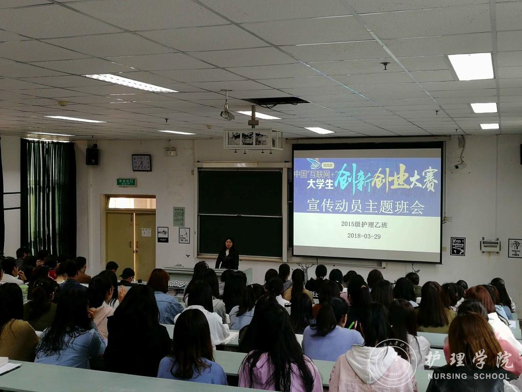 为提高同学们的创新创业意识,培养同学们创新创业的素质和能力,美加墨世界杯官方网站于3月29日下午5:30在北校区3302教室举行了第四届“互联网+”大学生创新创业大赛宣传动员主题班会。班会由班主任李红老师主讲,2015级护理乙班全体同学参会。