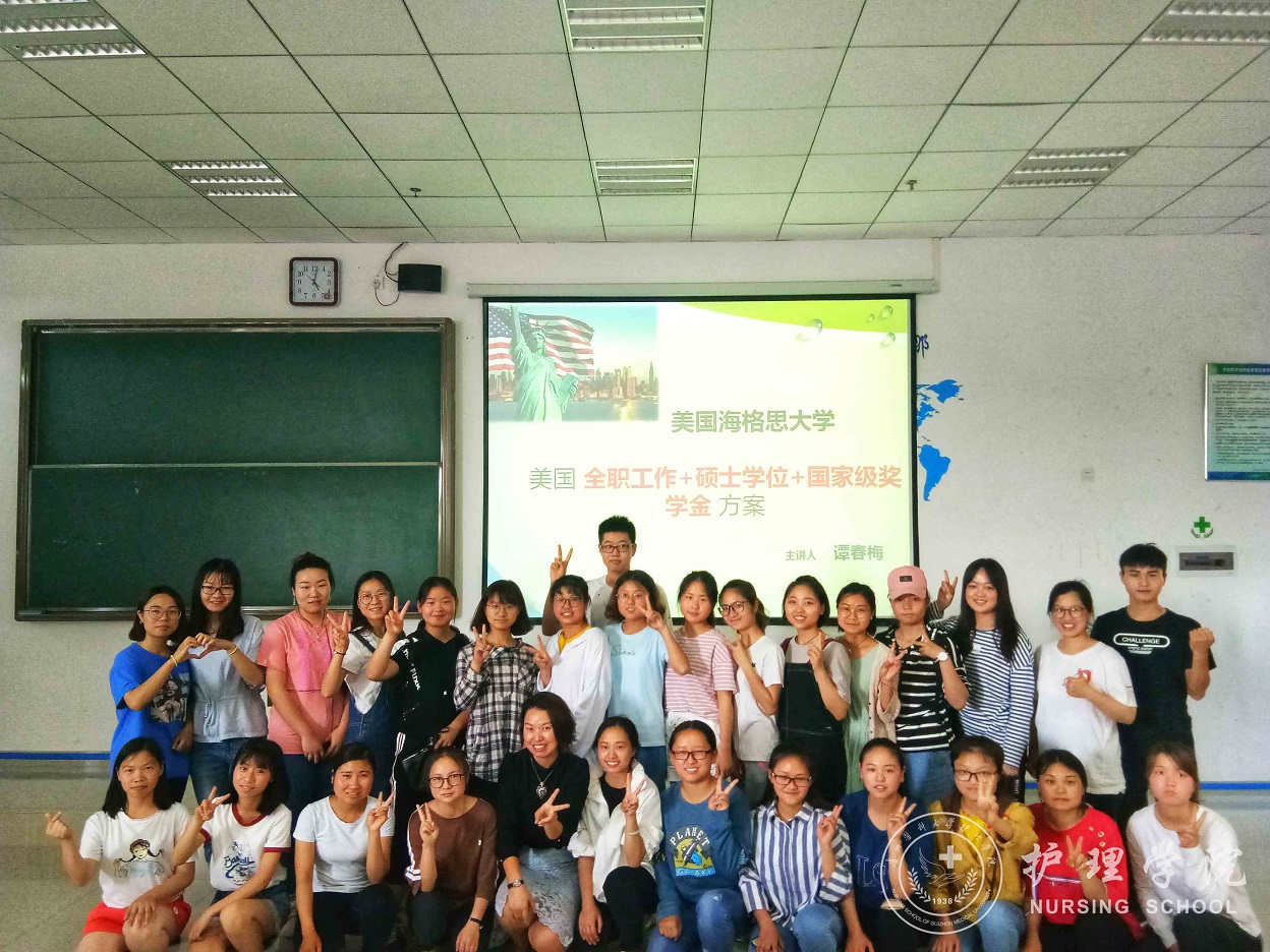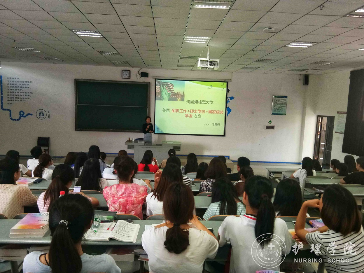 5月31日,世界杯官网在北校区召开的“美国护理职业现状及国外留学经验分享会”在学生中引起了强烈反响,得到应往届学生的广泛关注和好评。因此,世界杯官网特意邀请了美国海格思大学海外教育及就业的项目负责人谭春梅老师在我校南校区召开项目分享会,对低年级学生进行职业生涯规划与就业指导。