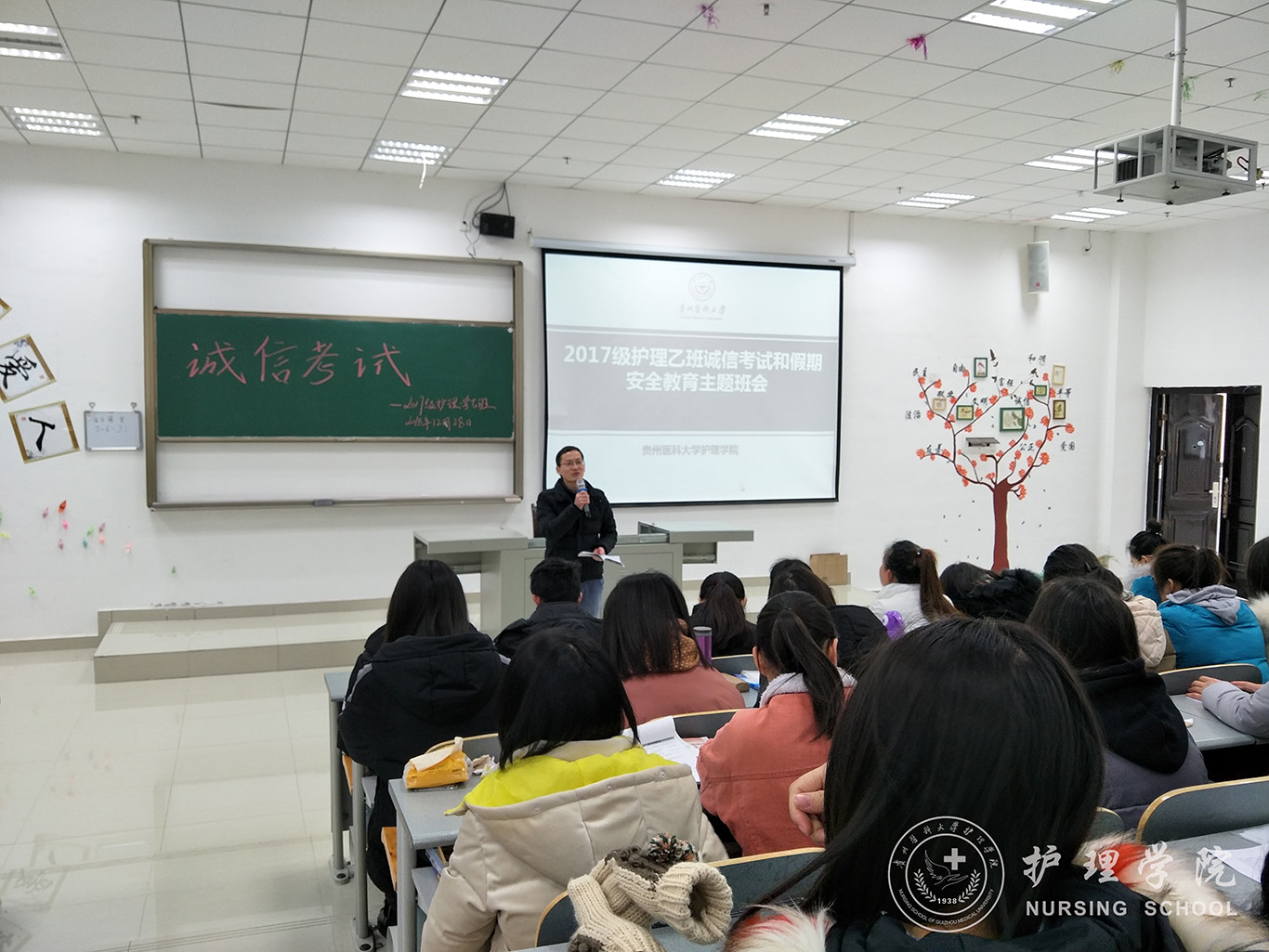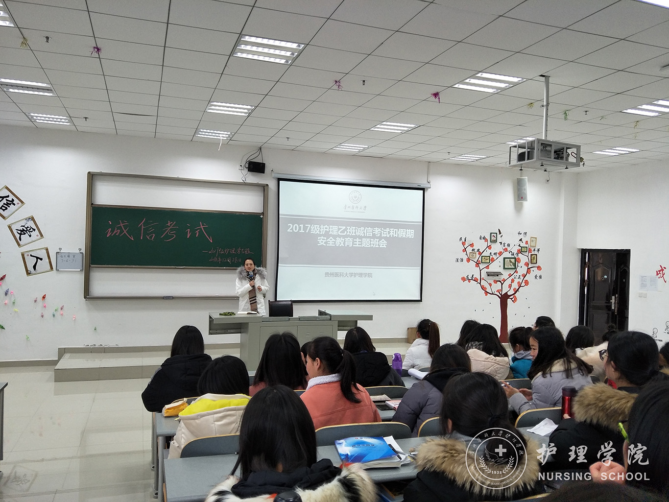 12月28日下午,美加墨世界杯官方网站在南校区7404和7406教室开展诚信考试主题班会。班会由2017级护理甲班、乙班两班班长主持,班主任吴俊、王丽和辅导员马景瑶主讲,全体同学参加。