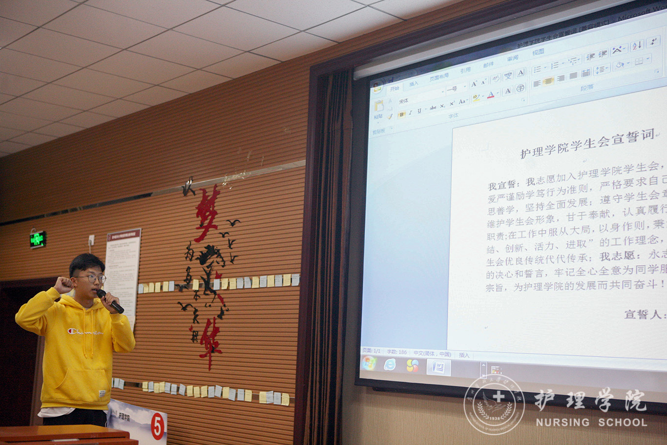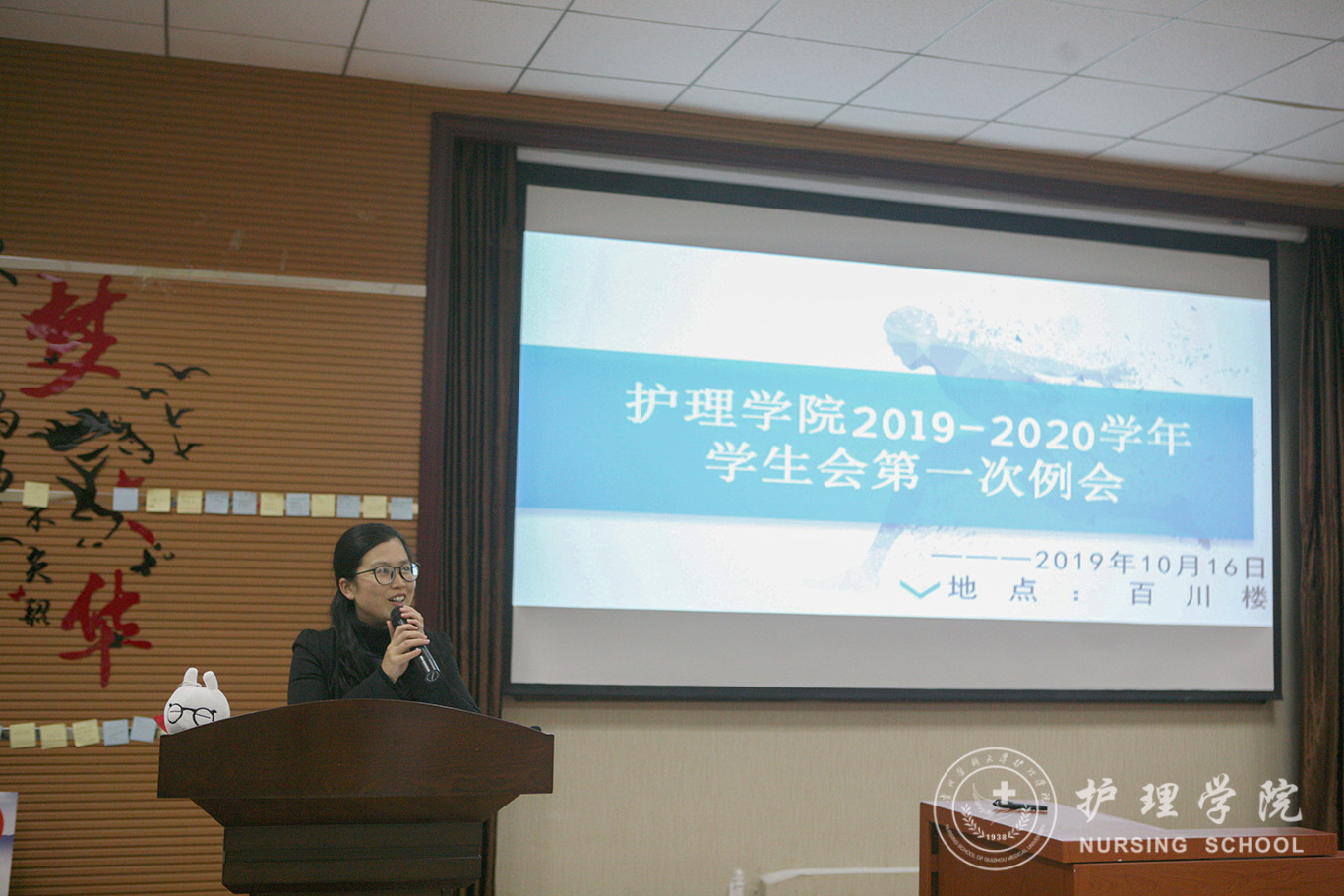 本次例会分为四个议程。第一项议程,毕丽老师讲话,她首先对2019级新成员加入学生会大家庭表示欢迎,接下来她对所有学生会成员提出了三点要求:第一,明确自己学生的第一身份,以学为主,在保质保量完成学业的同时积极组织或参加各类活动,在活动中提升综合素质。第二,树立服务意识,她强调作为学生会成员,应有服务学生群体的意识,工作认真不浮躁,并严格遵守学校规章制度,讲诚信,莫违规。第三,做表率,希望全体学生会成员在思想上、学习上、行动上做出表率,树立学生会集体的良好形象。第二项议程,礼仪部成员余含梅带领大家围绕“壮丽70年,奋斗新时代——不忘初心、牢记使命”主题,进行政治理论学习,生动讲述了新中国诞生70年来的发展成果,强调了“追梦新时代,奋斗新征程”发展方向。第三项议程,学生会主席陈娟进行述职发言,她主要介绍学生会的活动和纪律,各部门负责人的换届选举规则,希望学生会新成员以积极向上的态度面对未来的工作,并对全体学生会成员提出期望。接下来,各部门副部长进行述职,为同学们简要介绍了部门职能和近期工作安排。第四项议程,学生会副主席刘贤带领全体成员进行学生会誓词宣誓并合影留念。