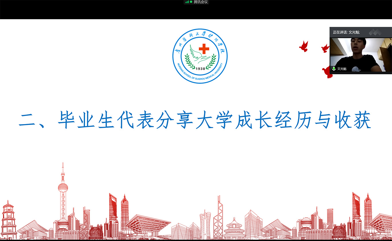 接下来,2020届毕业生文光魁、王伟月、王容三位同学作为毕业生代表分享了大学四年在贵医的成长经历与收获。跟着三位同学的分享,大家共同回忆进入贵医后的点点滴滴,回味了大学生活中的喜怒哀乐,追忆青春、畅想未来。三位同学代表全体2020届毕业生感谢美加墨世界杯官方网站全体老师、感恩贵医,同学们决心将大学的美好记忆带到工作岗位,不忘初心,砥砺前行。
