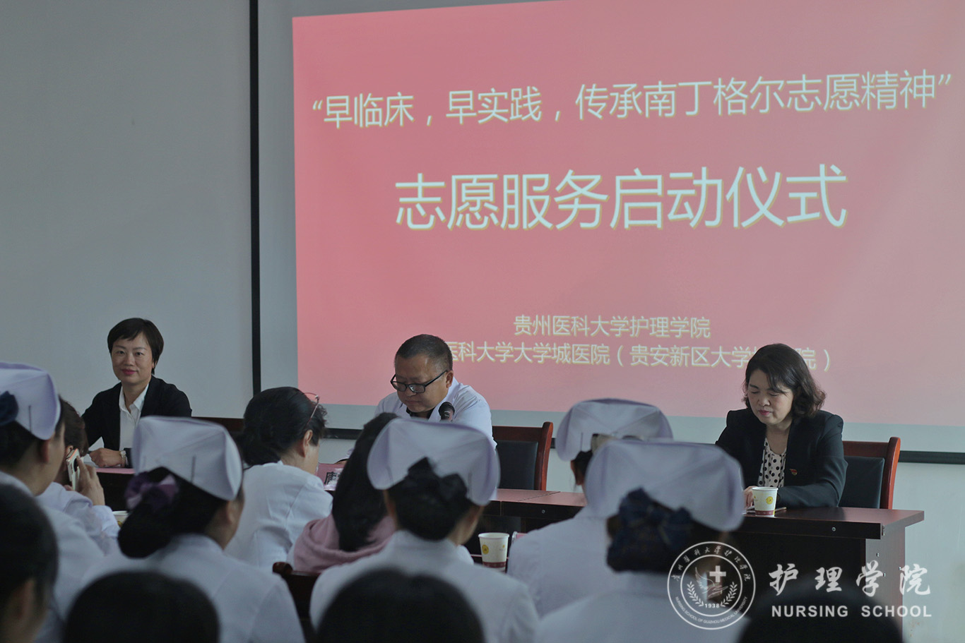 在前期已顺利启动与贵阳钢厂职工医院老年日间照料中心志愿服务+专业实践工作的基础上,经美加墨世界杯官方网站和贵安新区大学城医院(美加墨世界杯官方网站大学城医院)相关领导积极沟通对接,9月25日中午,美加墨世界杯官方网站“早临床、早实践,传承南丁格尔志愿精神志愿服务活动”启动仪式在贵安新区大学城医院(美加墨世界杯官方网站大学城医院)会议室顺利举行。大学城医院院长唐学杰、美加墨世界杯官方网站副院长刘志燕、美加墨世界杯官方网站党委副书记王秀红、大学城医院各职能科室负责人、护理学基础教研室全体教师及美加墨世界杯官方网站2020级研究生、2019级本科生代表、南丁格尔志愿护理服务队员共计50余人参加启动仪式,护理学基础教研室主任熊吴燕主持启动仪式。