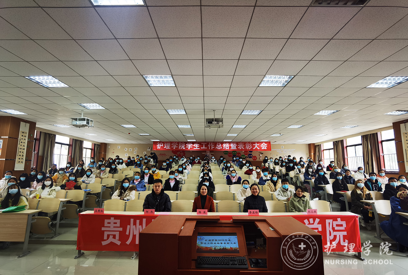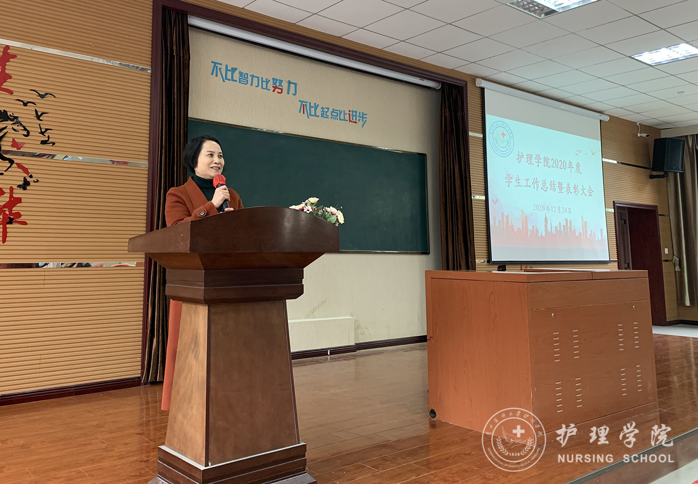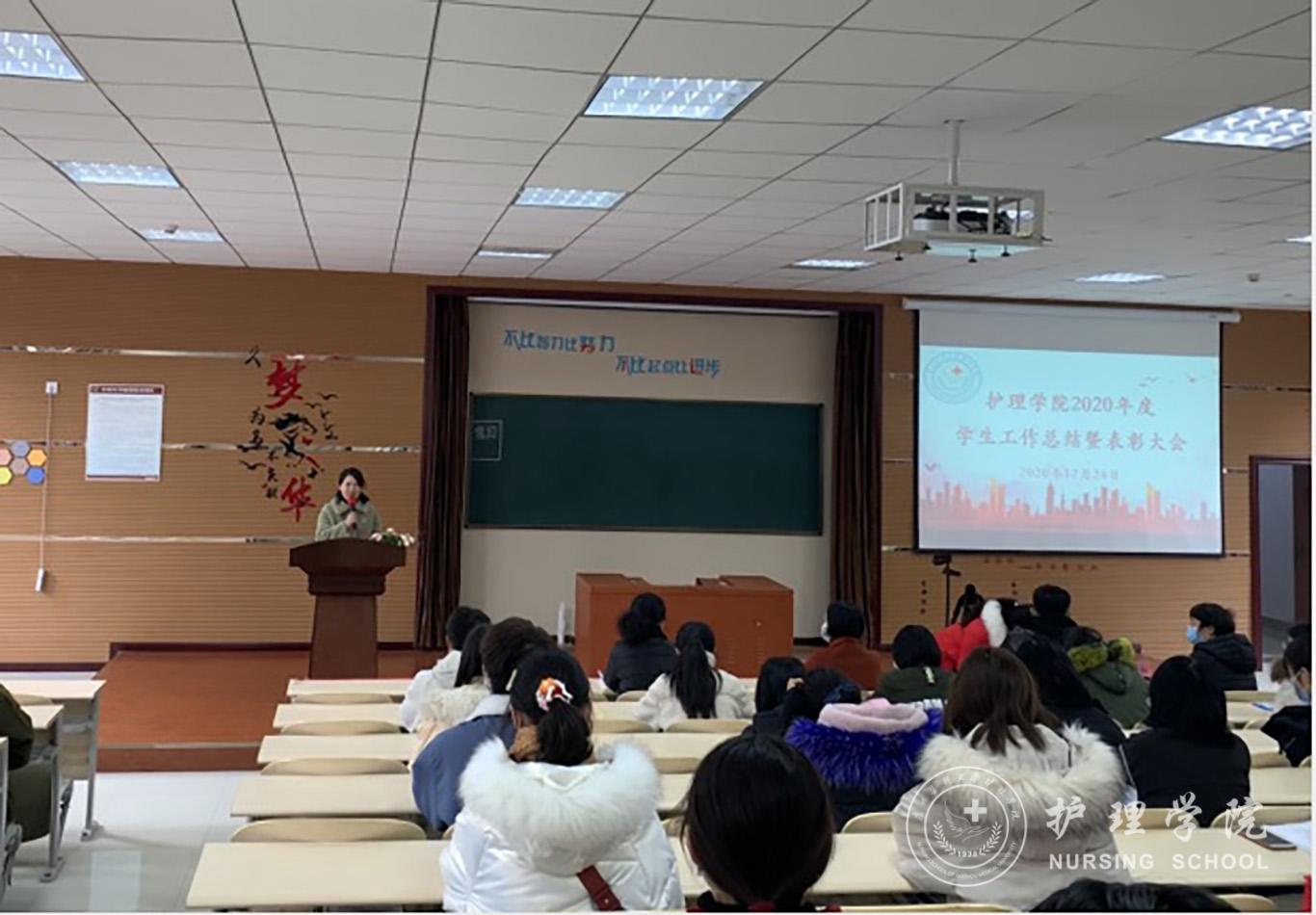 会议第一项议程:美加墨世界杯官方网站党委副书记何为作美加墨世界杯官方网站2020年度学生工作总结报告,何为从党团建设、学生日常管理以及获奖情况等方面对世界杯官网2020年度的学生工作进行了总结。第二项议程:美加墨世界杯官方网站党委委员、副院长刘志燕宣读了2020年度学生工作获奖名单。第三项议程:护理学2019级甲班团支书张凤毅作为获奖优秀学生代表作交流发言。第四项议程:美加墨世界杯官方网站党委委员、副院长王秀红讲话,她肯定了大家过去一年取得的成绩,鼓励大家继续努力再创辉煌。第五项议程:美加墨世界杯官方网站党委委员、院长李亚玲讲话,她向这一年来为学院学生工作付出辛勤劳动的老师和学生干部表示感谢,同时希望同学们学好专业课,通过自身的求学和工作经历引导大家对护理行业确立比较清晰的认识。第六项议程:美加墨世界杯官方网站党委书记杨英总结讲话,她对2020年度学生工作给予了肯定,给同学们提出了三点希望:第一、希望同学们牢记学生的身份,努力学习不松懈;第二、希望全体学生干部重视团队精神的培养,热爱专业、热爱班级、热爱学院。第三、希望同学们开拓创新、与时俱进,培养创新精神。大会最后一项议程:参与的领导为获得奖励的优秀个人和先进集体颁奖并合影留念。