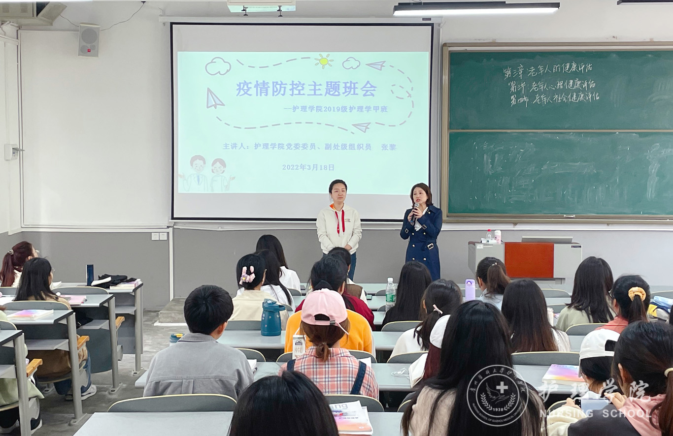 3月18日,因近期疫情反弹,我省遵义市务川县及周边省市连续出现新冠肺炎确诊病例和无症状感染者病例,根据疫情防控工作需要,为了更有效地抗击疫情,增强学生疫情防控意识,有效预防新冠肺炎“卷土重来”,保护好自己和他人身体健康,美加墨世界杯官方网站党委委员、副处级组织员张黎于北校区普教7教室对2019级护理学甲班进行随堂听课并召开“疫情防控”主题班会。班会由辅导员杨叶卿主持,全体同学参加。