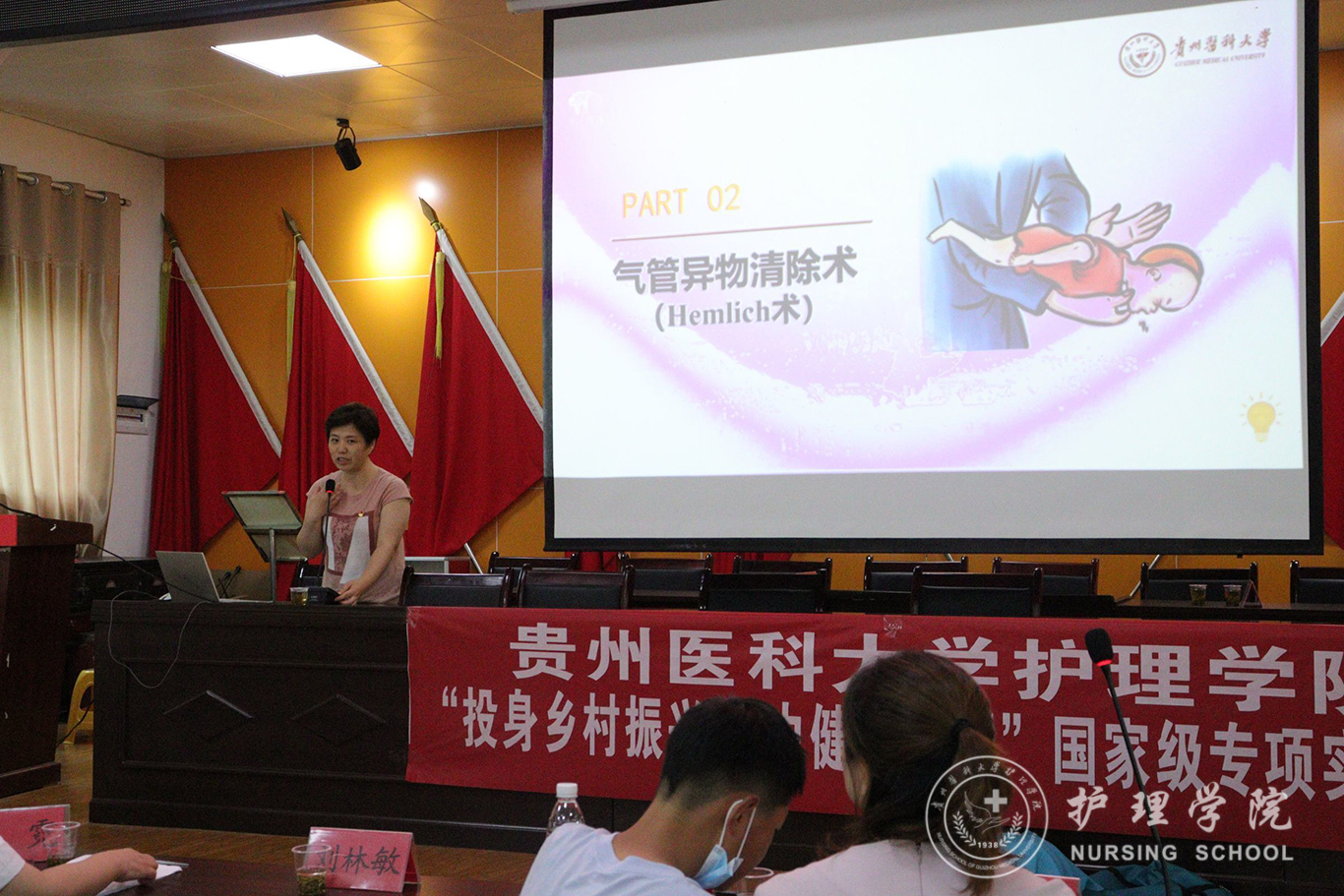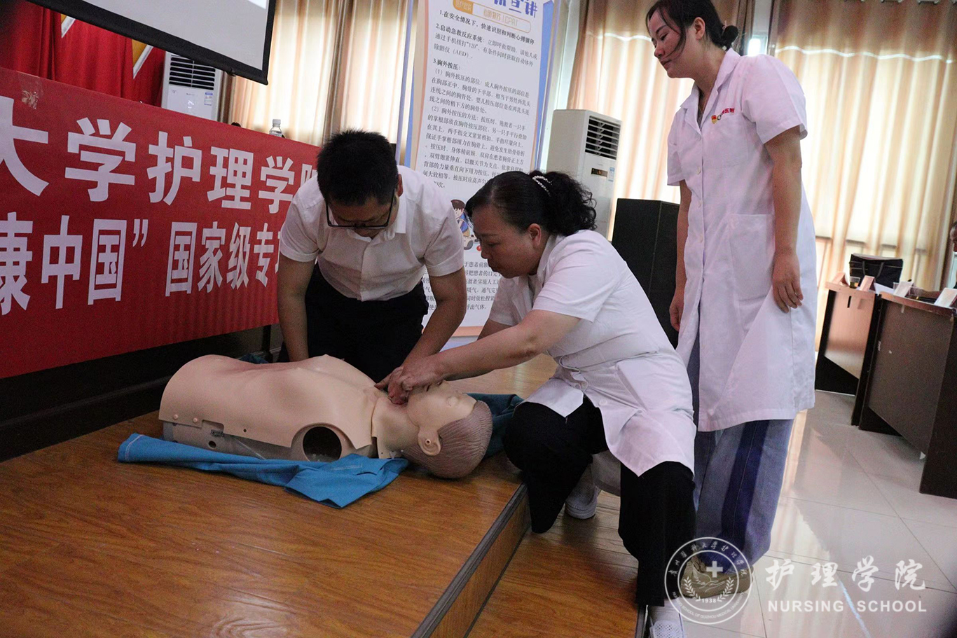仪式结束后,美加墨世界杯官方网站教师党员代表张仁莉、晏家芳、刘林敏、肖霓及美加墨世界杯官方网站2022年暑期三下乡社会实践服务队的同学向蕉溪镇人民政府全体职工及各村负责健康建设工作的干部开展了健康知识讲座,对海姆立克急救法、心肺复苏术等急救技术进行了宣讲。