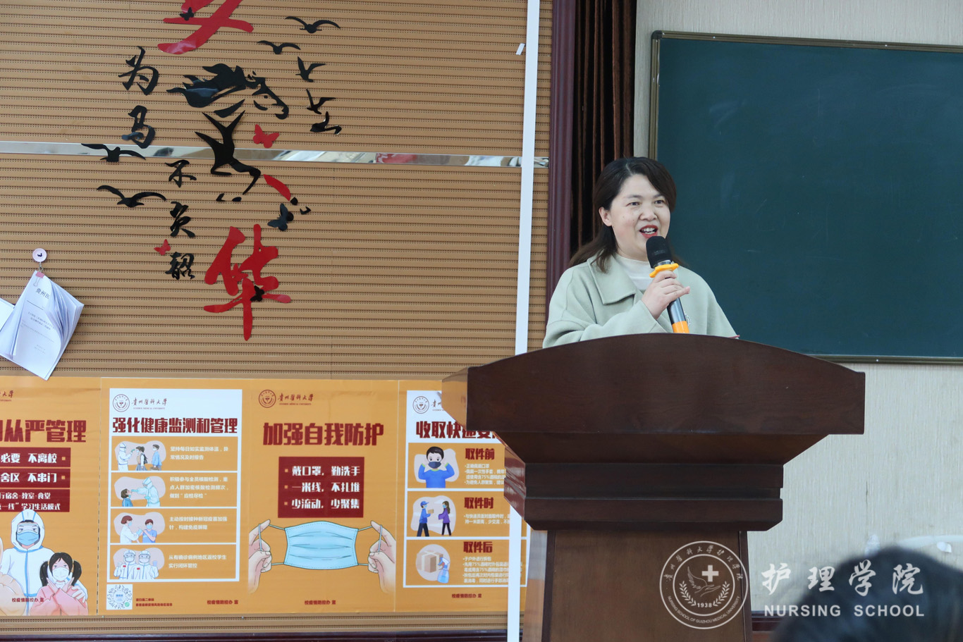 杨英对本次大会进行总结并讲话。她首先对获奖的集体和个人表示祝贺,同时给同学们提出了三点希望:一是希望同学们养成合理安排时间、多读书的习惯,不负韶华、不负人民,做有理想、有追求的护理学子;二是希望同学们自我约束,加强自立、重视时间管理,加强体育锻炼,勤奋耕耘,收获成功;三是希望同学们勇于担当,乐于奉献,敢于有梦,勇于逐梦,勤于圆梦,胸怀民族复兴的重任,在新的征程上再创佳绩。