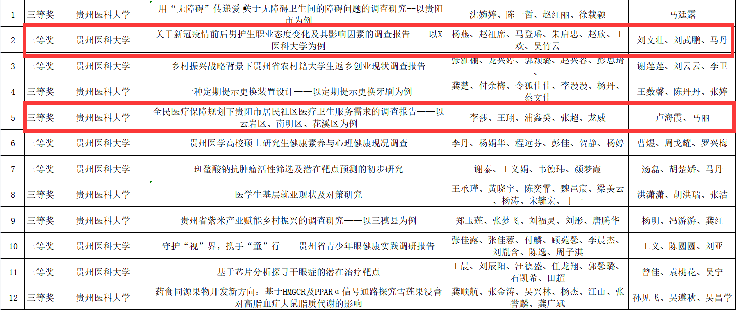在第十八届“挑战杯”全国大学生课外学术科技竞赛中,世界杯官网推出32支队伍参加了校赛,经过层层选拔,在贵州省终审决赛中,由刘文壮、刘武鹏、马丹指导的《关于疫情前后男护生职业态度变化及其影响因素的调查报告——以X医科大学为例》荣获省级三等奖,成员:杨燕、赵祖席、马登瑶、朱启忠、赵欣、王欢、吴竹云;由卢海霞、马丽指导的《全民医疗保障规划下贵阳市居民社区医疗卫生服务需求的调查报告——以云岩区、南明区、花溪区为例》荣获省级三等奖,成员:李莎、王珝、浦鑫癸、张超、龙威。