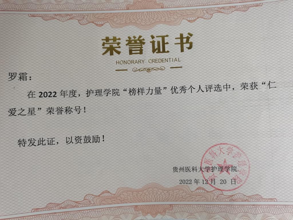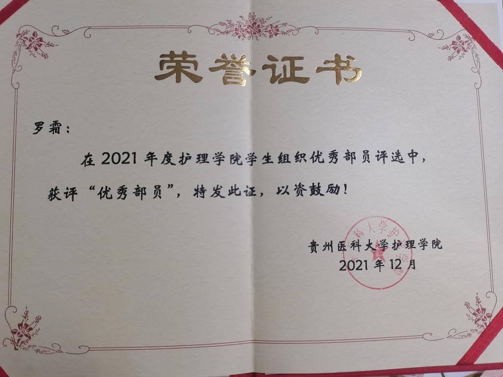 罗霜,女,汉族,中共预备党员,助产学2020级学生,现任护理技能协会技训部部长、班级疼痛护理学课代表,围生期保健学、急危重症护理学组长。大学期间,她学习认真踏实,成绩良好。在思想上,她积极向党组织靠拢,及时汇报自己的思想,已经成为一名光荣的中共预备党员。作为技训部部长,曾多次组织各班学生代表参与护理技能操作培训,积极参与各类校园文化活动和社会志愿服务,随时准备为社会贡献自己的一份绵薄之力。