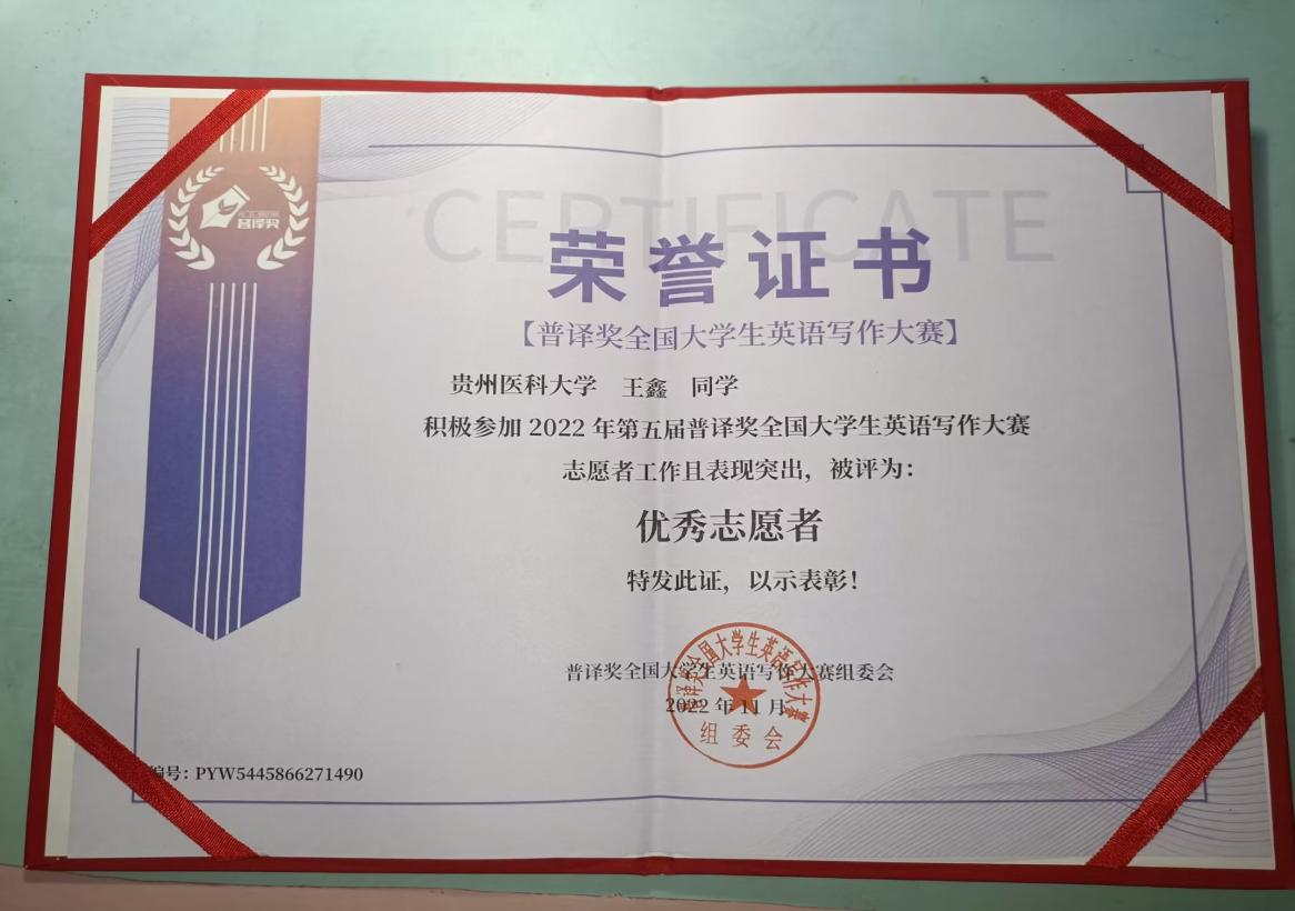 担任2022年第五届普译奖全国大学生英语写作大赛负责人,并在志愿服务工作中表现突出,荣获“优秀志愿者”称号: