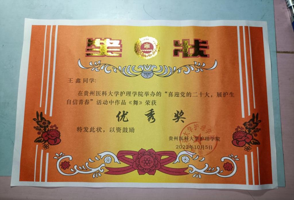 2022年10月积极参加学院举办的“喜迎二十大,展护生自信青春”活动,作品《舞》荣获“优秀奖”
