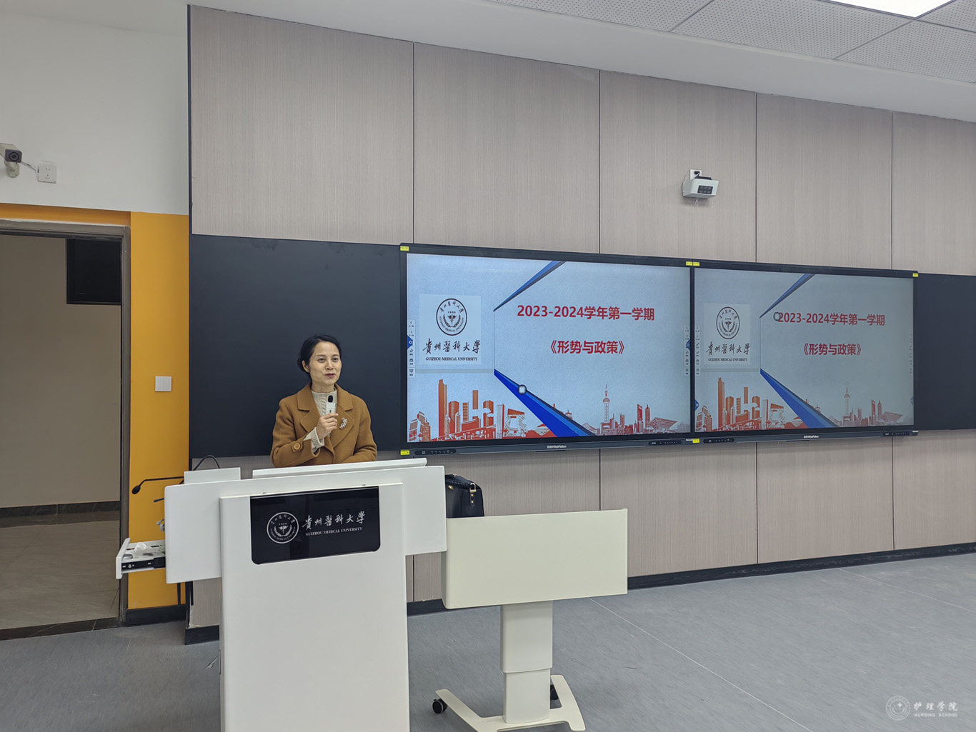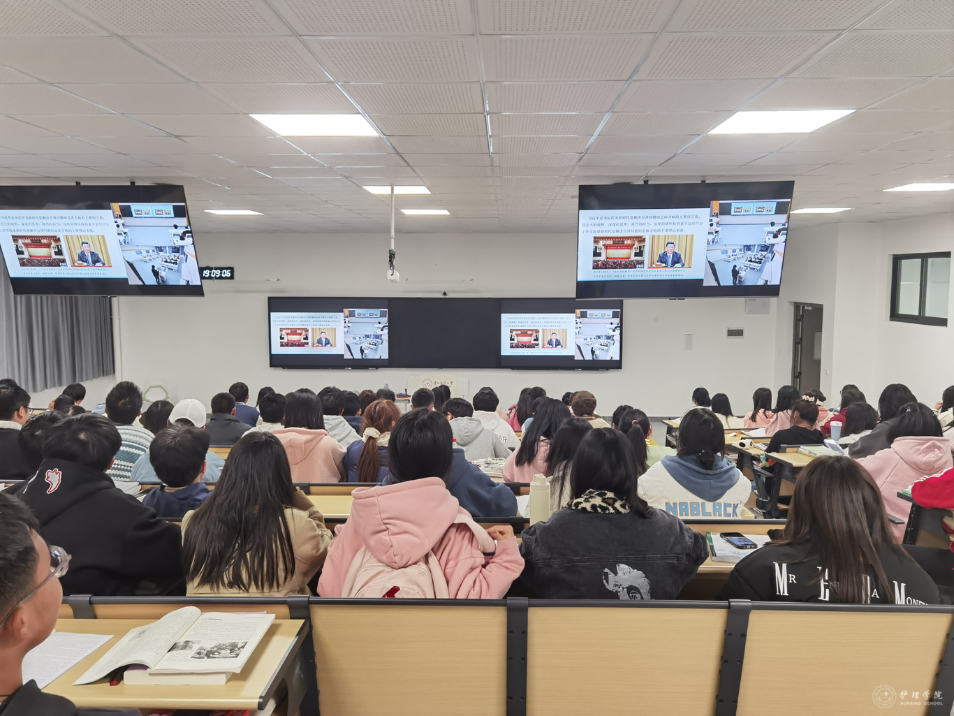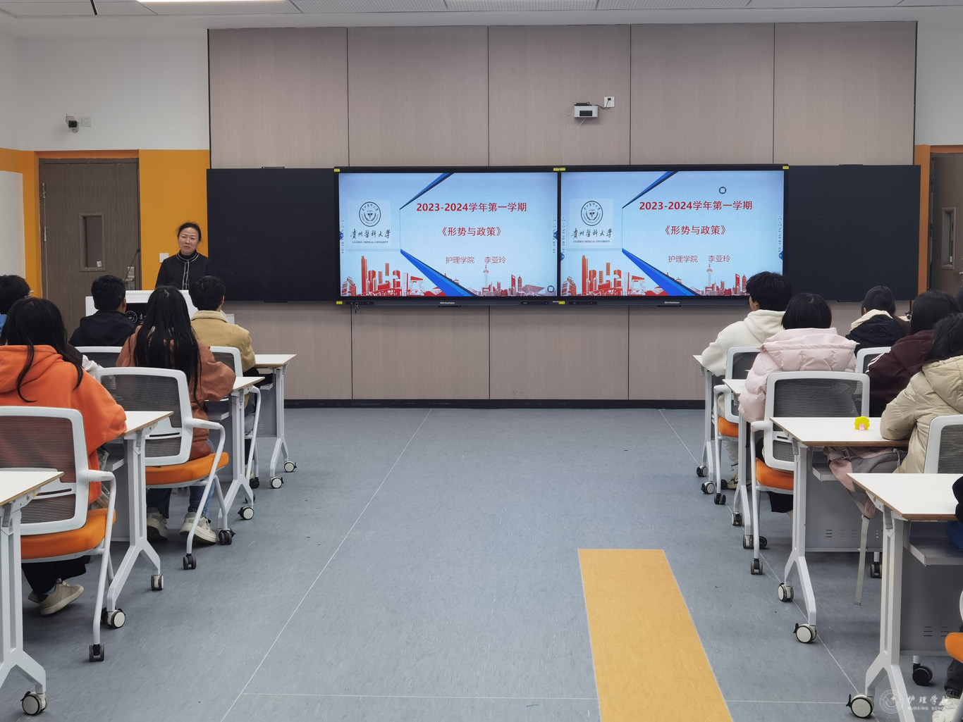 11月29日,为深入学习宣传贯彻党的二十大精神,进一步加强大学生思想政治教育工作,美加墨世界杯官方网站党委书记杨英、院长李亚玲以“读懂新时代党解决台湾问题的总体方略”为主题,在云漫湖校区基础组团L104S、L106S教室通过现场教学及云端课堂直播相结合的方式为美加墨世界杯官方网站2023级护理学和助产学全体学生讲授形势与政策课。