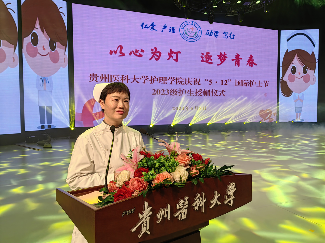 随着悠扬的音乐响起,年轻学子们身着白衣,手捧燕帽,有序入场,28名前辈亲手为他们戴上了圣洁的燕帽,这庄严而又神圣的时刻象征着贵医护理人的代代传承。在院长李亚玲的带领下,同学们纷纷举起右手,许下了“燃烧自己,照亮别人,把毕生精力奉献给护理事业。”的庄重誓言,齐唱《中国护士之歌》。