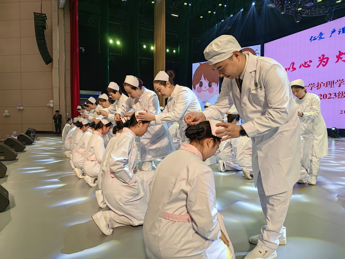 5月8日,在第113个5·12国际护士节到来之际,为弘扬救死扶伤和无私奉献的精神,培养护理学子的职业道德和理想信念,丰富校园文化生活,美加墨世界杯官方网站在云漫湖校区礼堂举办了以“以心为灯,逐梦青春”为主题的2023级护生授帽仪式,由28位优秀护理前辈为678名护生授帽传烛。学院领导班子、全院教职工及2022级、2023级学生参加本次授帽仪式,仪式由副院长王秀红主持。