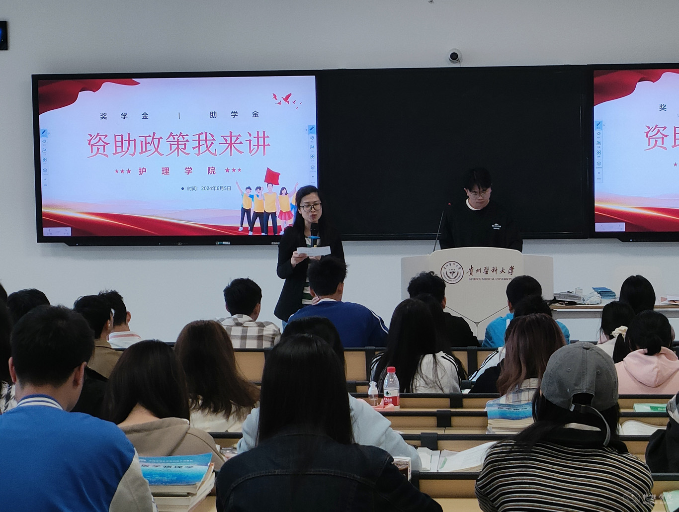 6月5日,为落实好国家资助政策,做好资助育人工作,美加墨世界杯官方网站在临床组团R310教室开展资助政策宣讲活动,活动邀请国家奖学金获得者曾令健同学主讲,学生管理科副科长毕丽主持,美加墨世界杯官方网站2023级和2022级部分学生代表参加。