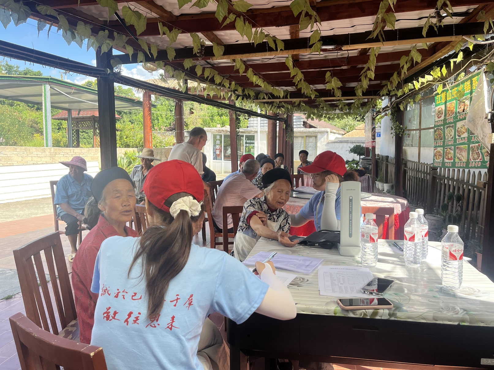 在嘉禾村和平寨村村委会工作人员的带领下,队员们分组走进村内高龄老人家中,向老人表达亲切问候,送上慰问礼品;陪老人聊天,倾听他们的故事和心声,给予情感上的支持和安慰;帮助老人测量血压,详细询问他们的身体状况,分析病情,向他们讲解饮食安全以及合理用药等常识;为老人检查家中的电器、线路等是否安全,排除安全隐患。