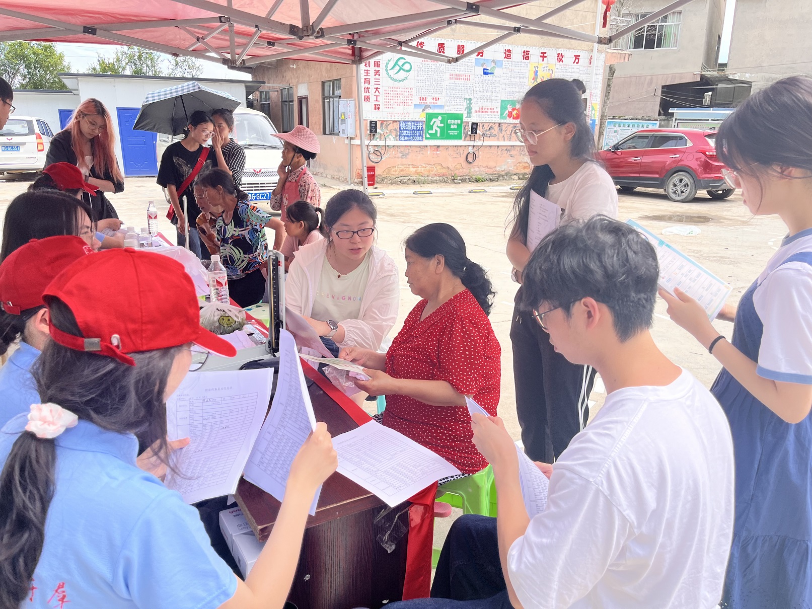 实践队在嘉禾村开展了医疗科普活动,面向当地村民进行健康知识宣讲和义诊服务。队员们协助老人们填写健康档案、量血压;讲解高血压、糖尿病等多种慢性疾病相关的知识和常用药品的使用方法;并将提前准备好的生活用品、医疗保健科普手册、营养膳食宣传单分发给村民们。村民们对本次义诊活动赞不绝口,夸赞青年一代有担当,有爱心。
