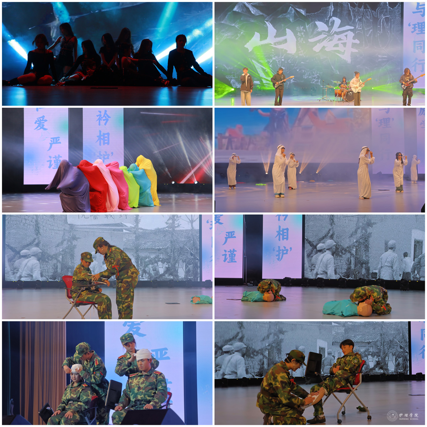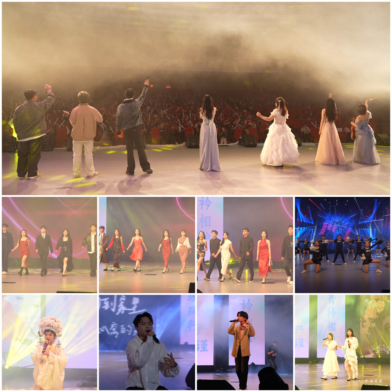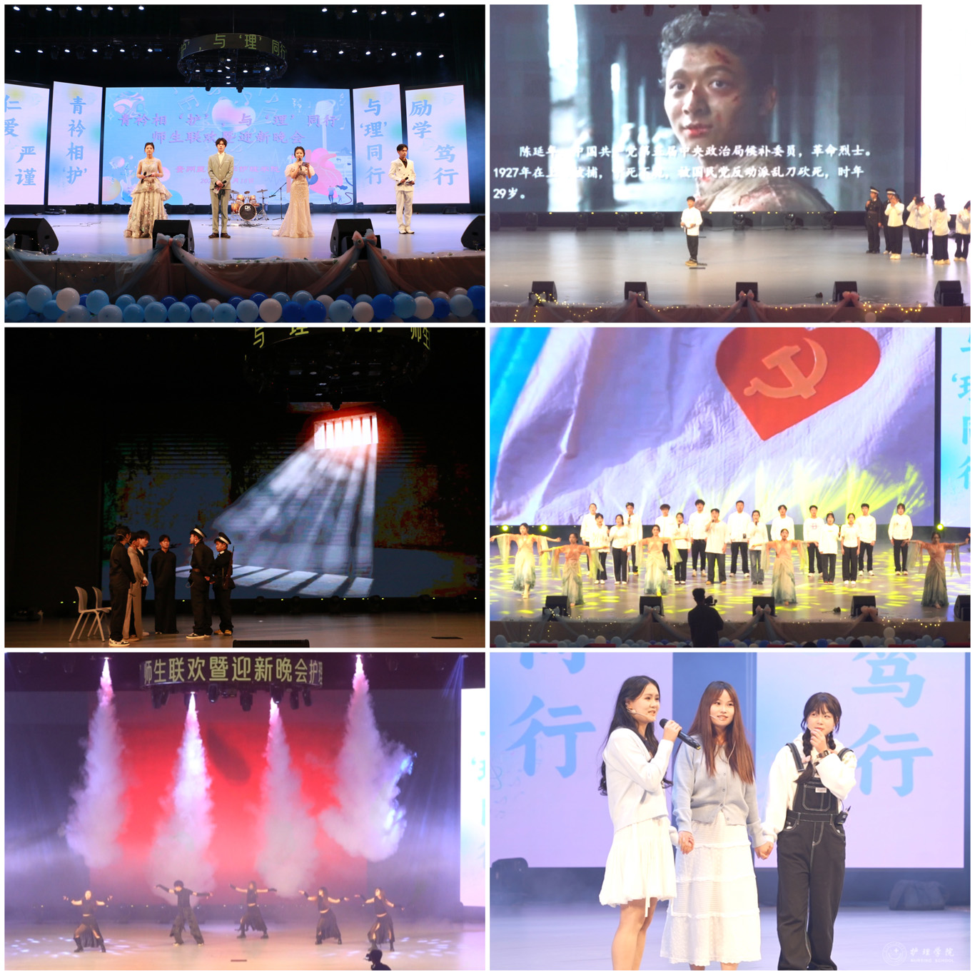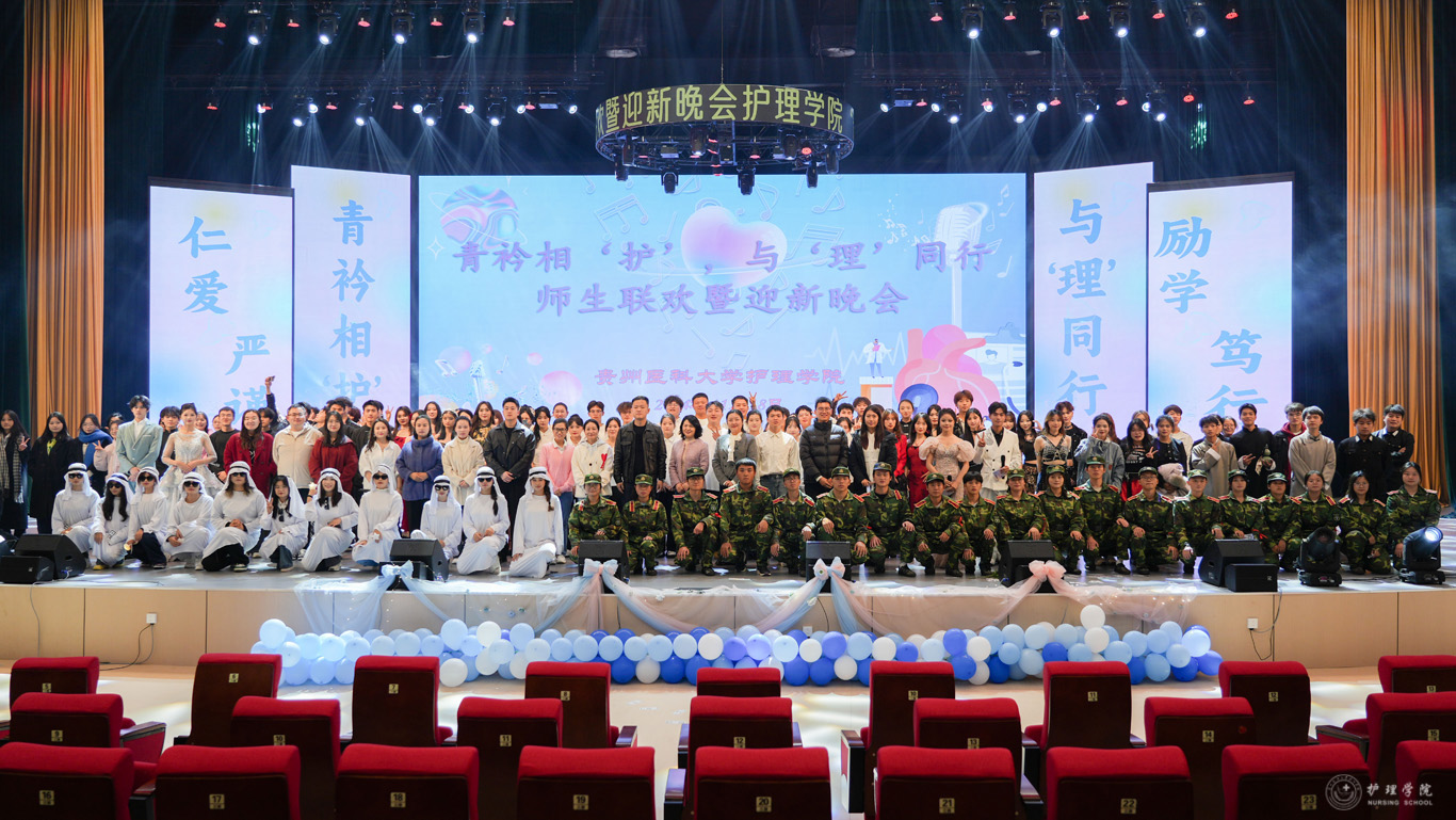 晚会现场热闹非凡,师生同台尽显三大篇章。第一篇章“辅导员才艺展示”,在脱口秀中徐徐展开,歌曲串烧《小美满》《爱》《特别的人》《我的天空》,用互动展现师生间浓浓的情谊,用歌曲表达对青春的礼赞。第二篇章“社团招新哪家强”,通过创新表演形式淋漓尽致展现同学们丰富多彩的校园文化活动。舞蹈串烧《sheesh》以欢快的节奏展现了青春的活力与激情。《未来》《热曲串烧》等动听的歌曲轮番上演,让观众沉浸在音乐的无穷魅力中,成功点燃了现场观众的热情。啦啦操表演更是将现场气氛推向高潮。爵士舞《wasteland》充分带动了台下气氛,让观众们置身于充满无限浪漫主义的世界。一首跨越时空的《山海》,最初的理想与现实的倒错不过就是跌跌撞撞,历尽千辛万苦也别忘却初心。舞蹈《伪装》唤起童年的回忆,灵动的舞蹈梦回鲜活的角色,我们在活泼可爱的音律和舞步中,探寻童年的回忆。第三篇章“青春绽放”以《战争下的救护》开场,仿佛革命时代的星星之火如在眼前,以抗战时期的抗战画面,展现战争中护理人乘风破浪的精神。今天的贵医护理人,穿越历史的回响,接过时代的长枪,向着远方发出青春的呐喊,追寻努力的勋章。走秀《穿越-漫步时空》充满自由与力量,同学们自信阳光的神态,体现了青年学子对美的追求和对生活的无限热爱,赢得掌声连连。舞台剧《笑傲风云·延年篇》从时空穿梭、虚拟现实贯穿的角度,以生动的情节和真挚的情感传达出陈延年的革命乐观主义精神,打动了现场的观众。