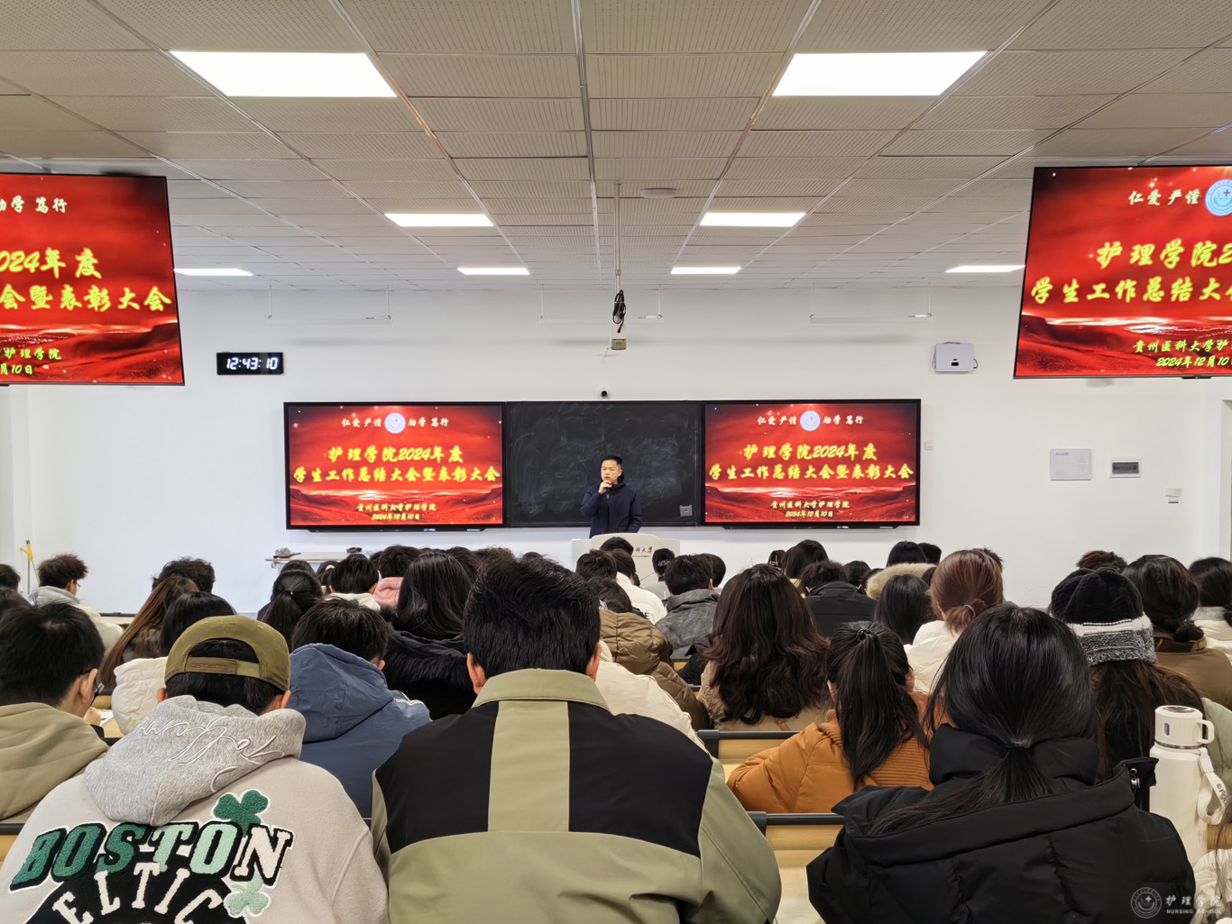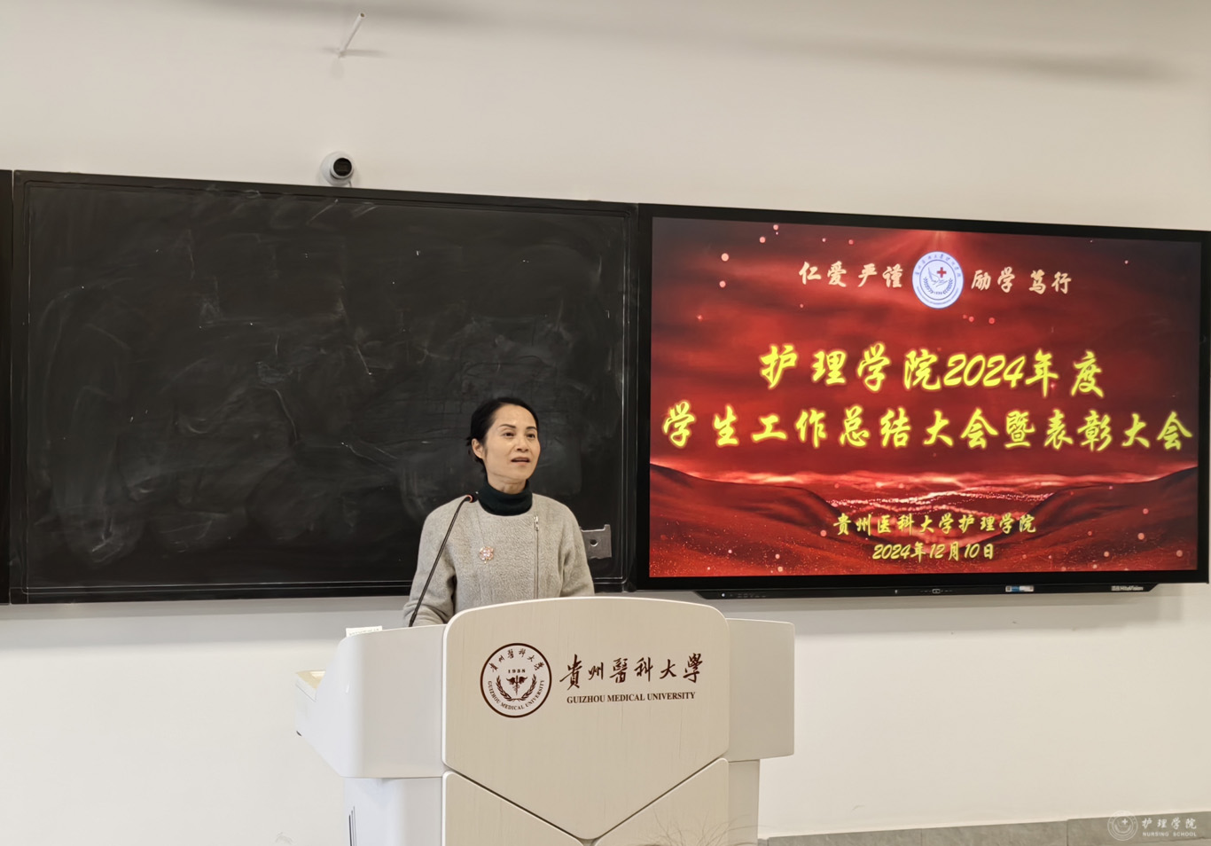 杨英对本次大会进行总结并讲话。她首先对学院学生工作取得的成绩给予肯定,代表学院党委和行政对学院学生工作付出辛勤劳动的老师和同学表示由衷的感谢。随后,她结合护理学专业,从厚植家国情怀到贵医护理人的使命与担当,鼓励同学们主动作为,善做善为,敢于创新,争做熠熠生辉的贵医护理人。同时,她还提出了三点希望:一是要秉持贵医护理人的情怀,注重人文关怀;二是要努力创新,增强本领;三是面对挫折和困难,要保持豁达,不畏艰辛才能一路成长。