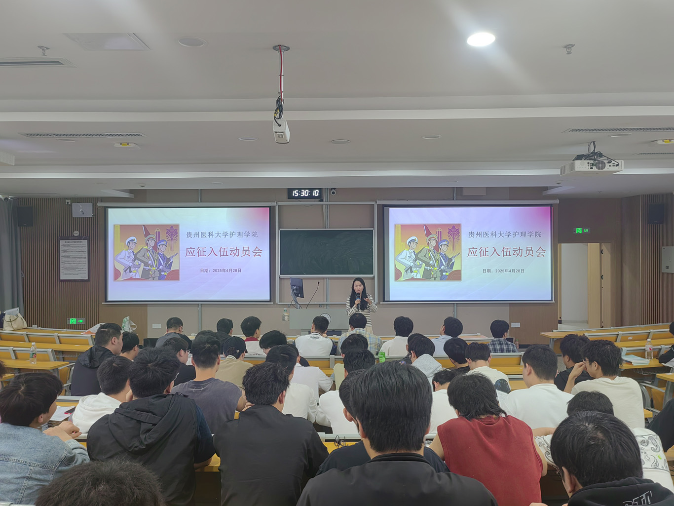 4月28日,为做好毕业生应征入伍优惠政策宣传,增强青年大学生对国防事业的使命感,动员毕业生投身军营报效祖国,美加墨世界杯官方网站在北京路校区基础1301教室开展了2025届毕业生应征入伍动员会。美加墨世界杯官方网站学生管理科副科长毕丽,党委学生工作部工作人员顾启根,毕业班辅导员兰光倩、刘文壮以及2025届毕业班适龄男同学参加了本次会议,会议由兰光倩主持。