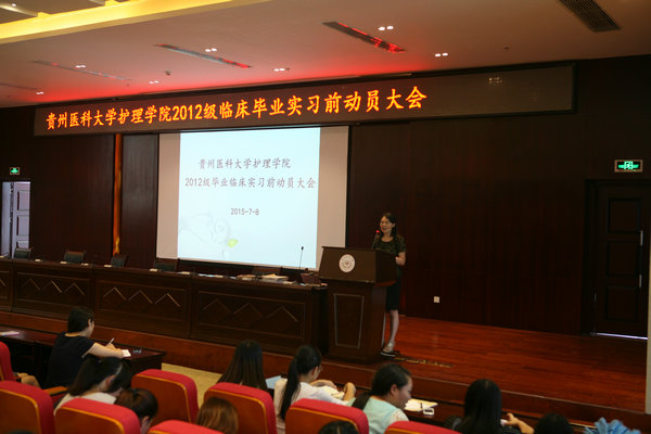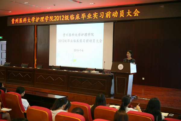 为了帮助学生做好进入临床实习心理准备,确保毕业实习工作顺利进行,美加墨世界杯官方网站于2015年7月8日下午在花溪校区道德讲堂召开了临床毕业实习前动员大会,美加墨世界杯官方网站党委副书记杨英、副院长刘志燕、学生科科长曾敏、办公室副主任张常喜、辅导员毕丽及2012级本科班学生参加了此次大会。会议由生产实习科科长柳忠燕主持。