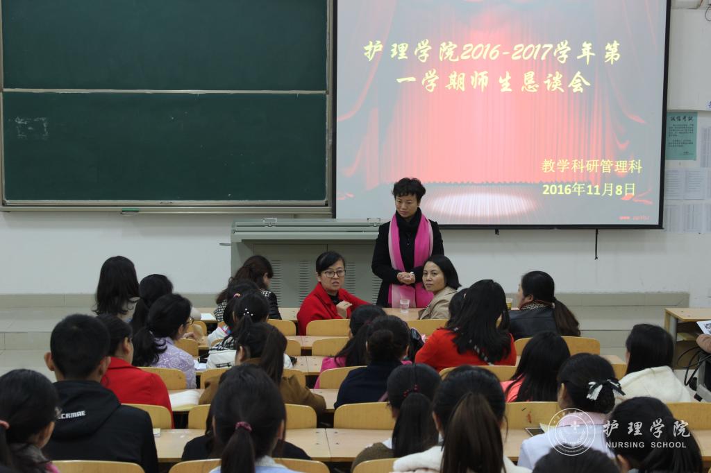 美加墨世界杯官方网站2016-2017学年第一学期师生恳谈会分别于11月8日、9日在北校区4101教室及南校区5楼会议室召开。美加墨世界杯官方网站党委副书记杨英、副院长刘志燕及各教研室、职能部门负责人、教研室老师及来自临床的教学老师,2014级、2015级、2016级护理学本科班及护理学(助产方向)学生代表参加了此次恳谈会。