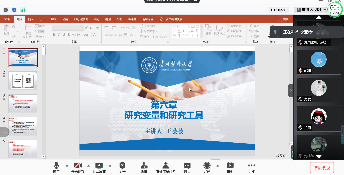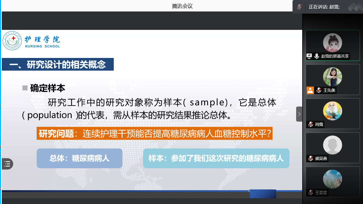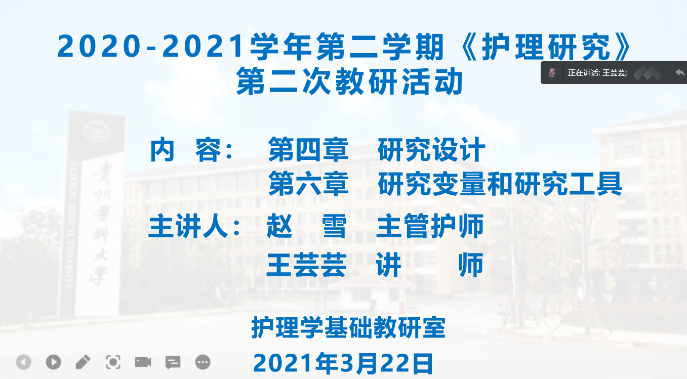首先,护理学基础教研室副主任熊吴燕阐述进行本次集体备课的形式、备课教师和备课内容。希望通过说课,明确教学重点、教学方法,加强教学创新。接着,主备课教师赵雪从教学设计、教学方法等方面对第四章研究设计进行说课,参与集体备课老师从课程内容特点、教学方法及教学手段的选择和运用等方面提出中肯的建议。刘志燕副院长建议将思政元素融入到课堂,结合案例深入浅出进行讲解,注意突出重点、加强PPT制作。随后,王芸芸老师饱含激情、图文并茂地分享了第六章研究变量和工具的教学思路、教学方法、创新特色等。参会老师纷纷表示王芸芸老师授课重点突出、课堂设计合理,从说教材、说学生、说教法等方面进行广泛交流。王秀红副院长赞扬了王芸芸老师此次说课,并从教学目标、重点难点、案例引入等方面进行了指导。
