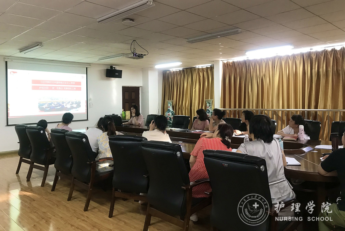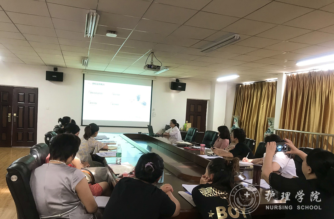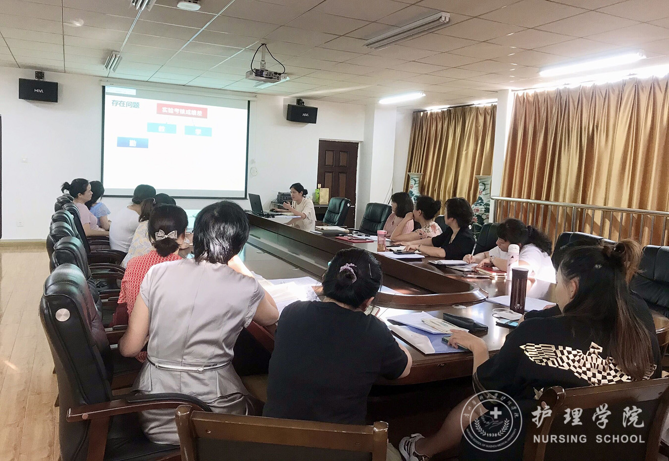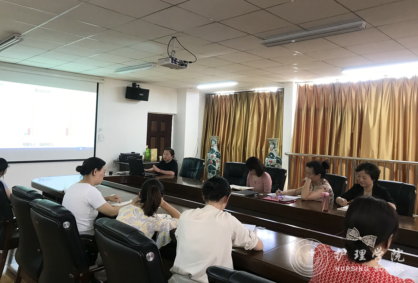 会上,首先分别由内科护理学教研室副主任晏家芳、外科护理学教研室副主任韩樱、妇儿科护理学教研室副主任刘林敏、护理人文教研室副主任张仁莉、护理学基础教研室副主任熊吴燕依次汇报本学期教研室教学工作情况。从教学基本情况,教学管理、教学方法、实验教学、科研工作、题库建设、成绩管理等多方面进行详细汇报,分析了教学工作中现存问题和后期改进思路。接着,由教学科研管理科科长卢海霞汇报《基于一流课程申报的体会——实验课设计及环境管理》,结合一流课程申报从实验课存在问题、课程设计、不足及展望等方面进行了介绍。内科护理学教研室贾玉玲老师做了《案例教学实验课实施方案》的分享,以不断创新的教学方式和方法,激发学生学习兴趣,提升临床实践效果。妇儿科护理学教研室戴黎黎老师分享了ppt制作的技巧。