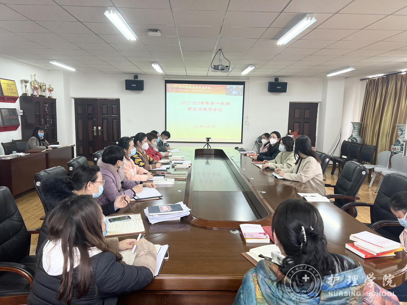 12月14日,美加墨世界杯官方网站在南校区美加墨世界杯官方网站五楼会议室结合腾讯会议召开2022-2023学年第一学期第3次教学工作会议。院长李亚玲、副院长刘志燕、全体专业教师、教学科研管理科全体人员参会,卢海霞科长主持会议。