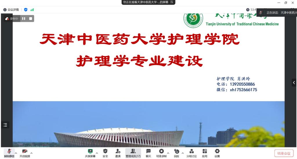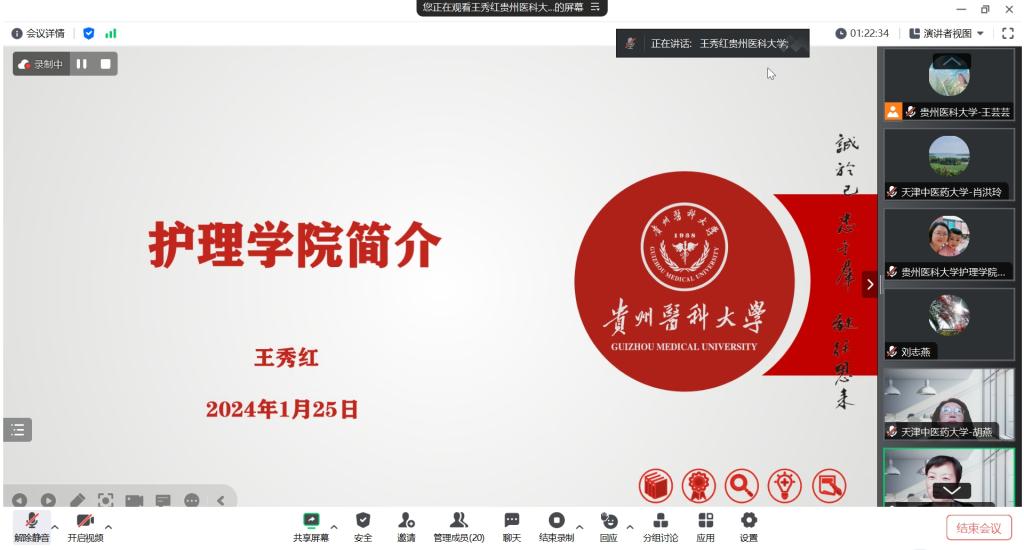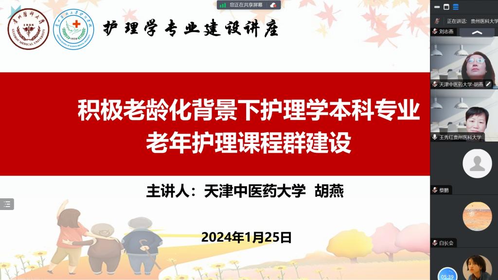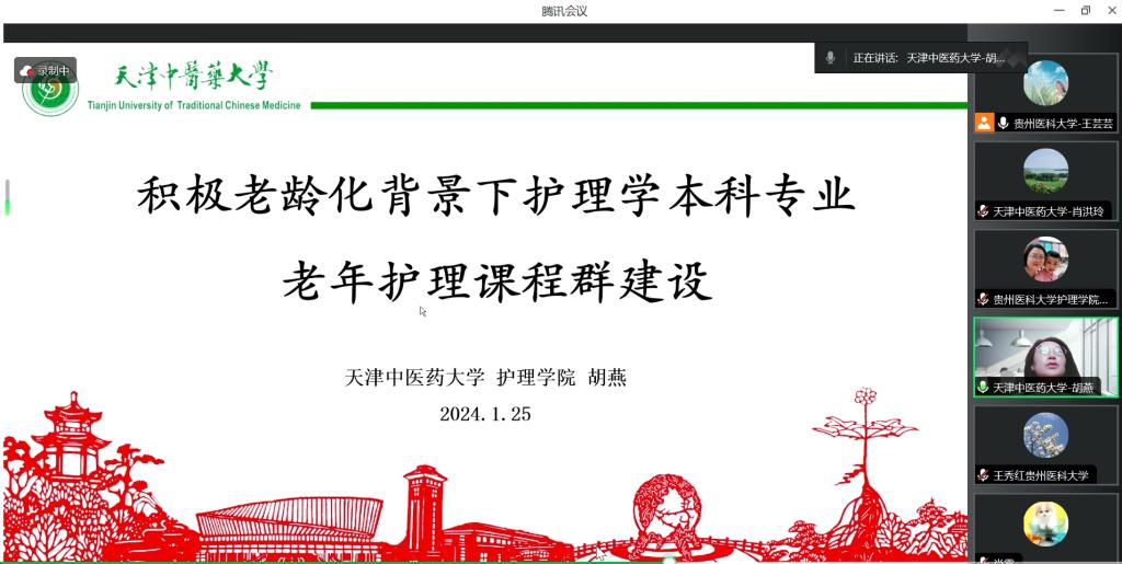 1月25日,美加墨世界杯官方网站与天津中医药大学美加墨世界杯官方网站通过线上平台开展了老年护理学课程教学交流。天津中医药大学美加墨世界杯官方网站副院长肖洪玲,老年护理学教研室主任、老年护理专业方向负责人胡燕,美加墨世界杯官方网站副院长刘志燕、副院长王秀红、附属医院护理部副主任蔡鹏及来自美加墨世界杯官方网站和附属医院的教师近30人参加活动。活动由护理学基础教研室主任兼护理学技能实验室主任熊吴燕主持。