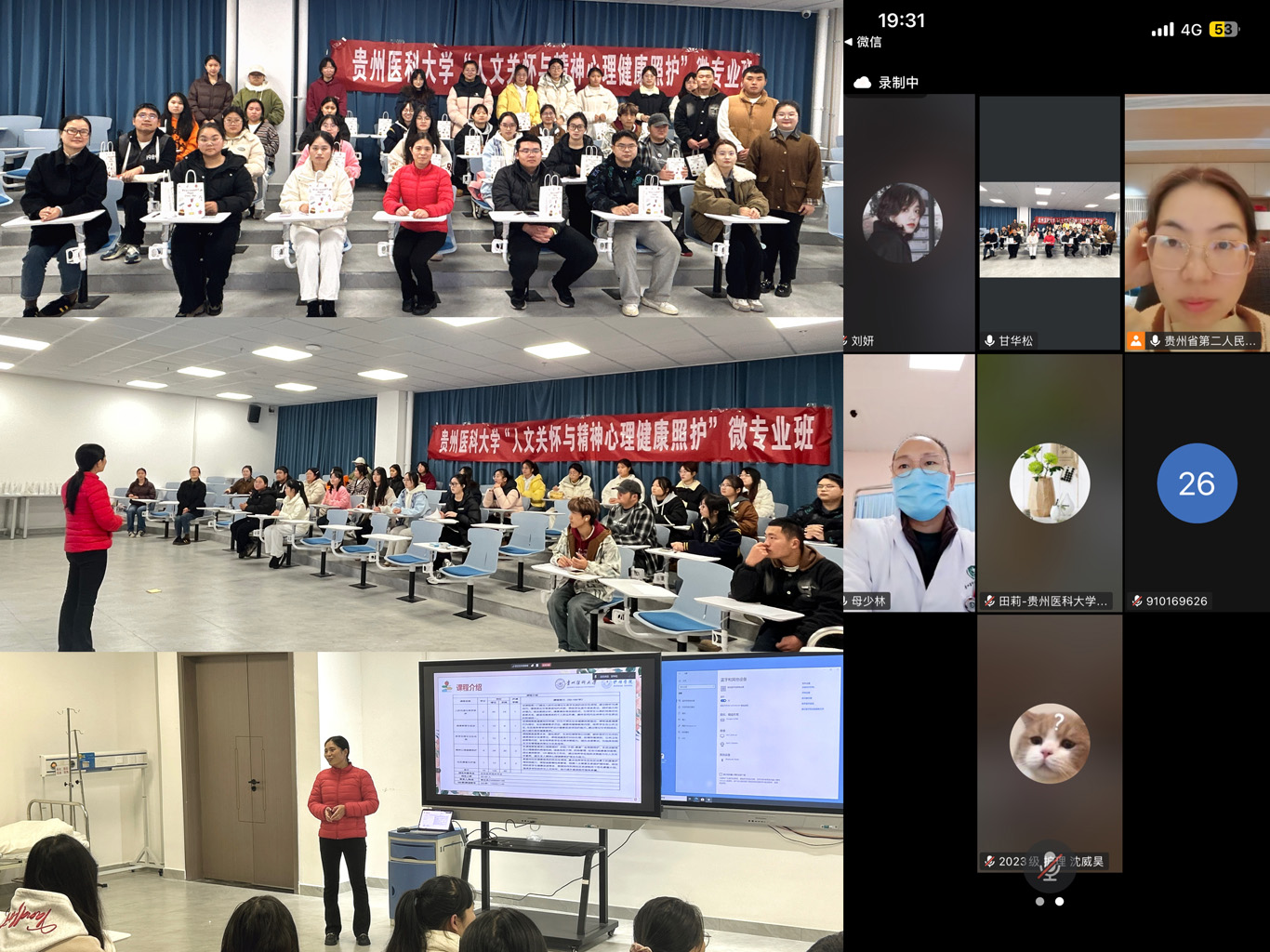 为积极响应国家加强精神卫生服务体系建设的号召,适应新时代精神健康服务需求,培养兼具专业技能与人文关怀素养的健康照护人才,美加墨世界杯官方网站开设的“人文关怀与精神心理健康照护”微专业于11月3日在云漫湖校区临床组团酬勤楼示教室举行了开课仪式。开课仪式采用线上线下相结合的方式进行。护理人文教研室主任张仁莉,教师李红、刘妍以及美加墨世界杯官方网站附属医院心理精神科护士长田莉、精神专科护士母少林和甘华松、贵州省第二人民医院康复科主任刘义、课程秘书覃启柔等微专业团队老师以及32名微专业学员共同参与。