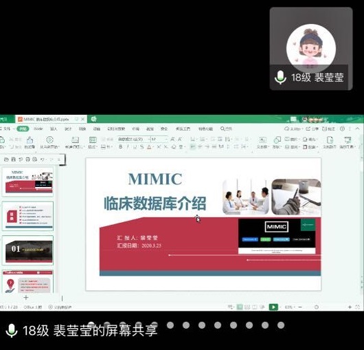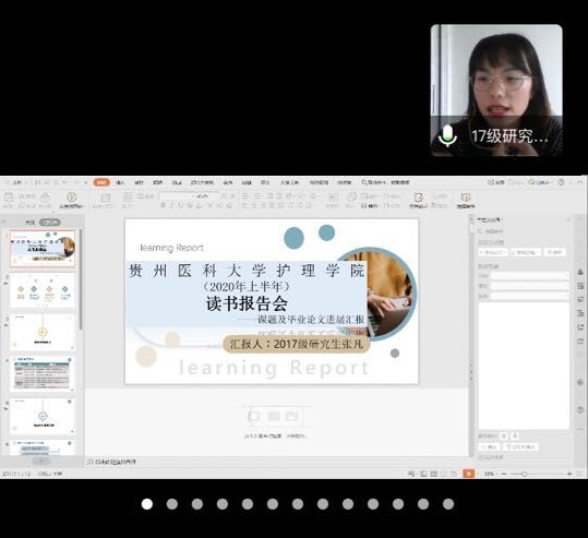 会议由美加墨世界杯官方网站党委副书记王秀红主持。本次读书报告会共分两个环节进行,首先由2017级方雯、覃瑛、张凡、李晓杰4位同学汇报了课题进展及学位论文完成情况,同学们结合自身完成课题和学位论文撰写过程中的经验和体会做了分享和交流。随后导师和同学对4位同学的汇报进行了点评。接下来的环节,2018级研究生张丽娟和裴莹莹分别以PPT形式进行了15分钟的读书报告汇报。张丽娟以“冰山理论”为题,分享了冰山理论核心观点及在护理研究领域的应用,裴莹莹以“MIMIC数据库介绍”为题,较为系统介绍了MIMIC数据库的使用。导师们根据学生的综合表现进行线上面对面点评,同时通过问卷星对学生汇报内容就选择意义、内容掌握、延伸拓展等方面进行综合考评,作为研究生培养学术综合成绩评定参考。