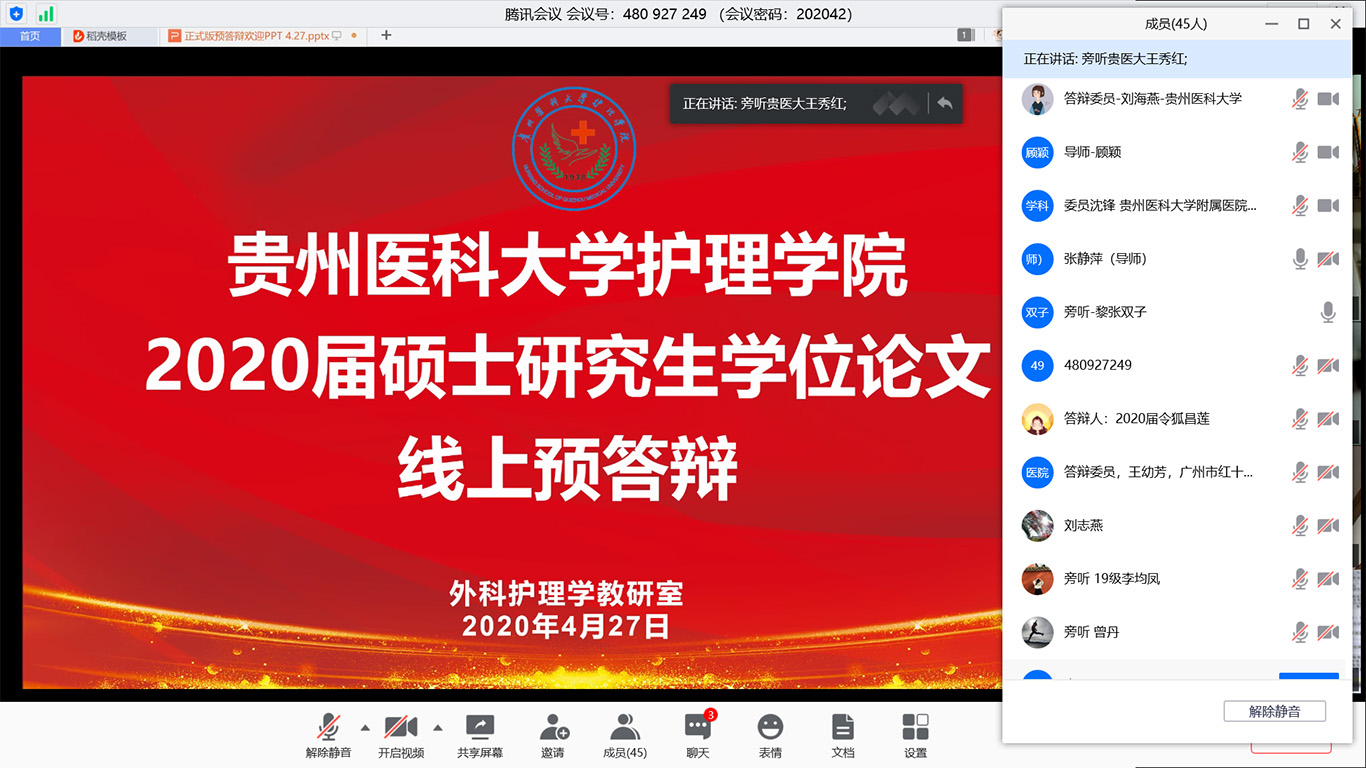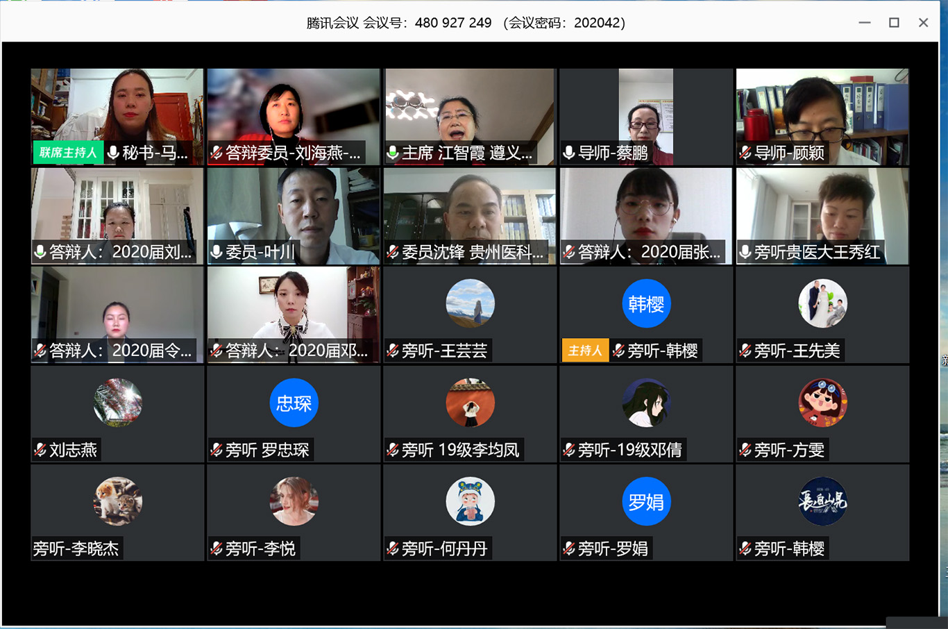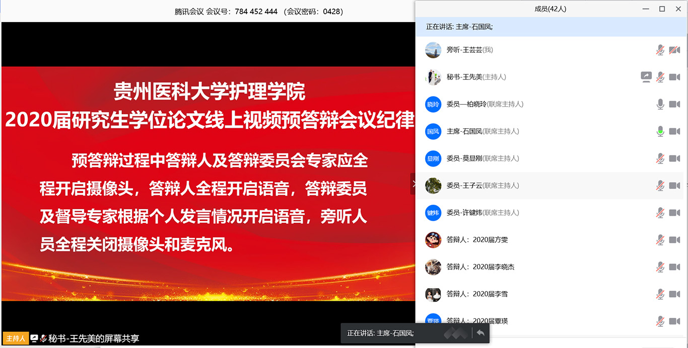 此次线上预答辩采用腾讯会议平台,8名毕业班研究生同学按研究方向分成两组进行。答辩委员会主席和委员分别由贵州中医药大学美加墨世界杯官方网站党委书记石国凤教授、遵义医科大学美加墨世界杯官方网站院长江智霞教授、贵州省人民医院柏晓玲博士、美加墨世界杯官方网站附属医院ICU主任沈锋博士、骨科博士后叶川教授、老年医学科教授莫显刚博士、广州红十字会医院王幼芳副主任护师、美加墨世界杯官方网站公共卫生学院王子云博士、刘海燕副教授、美加墨世界杯官方网站基础医学院许健炜博士担任。两场预答辩共有近100人参加,学校研究生教育督导专家、美加墨世界杯官方网站及附院导师、专业教师和全体研究生同学参加预答辩旁听。