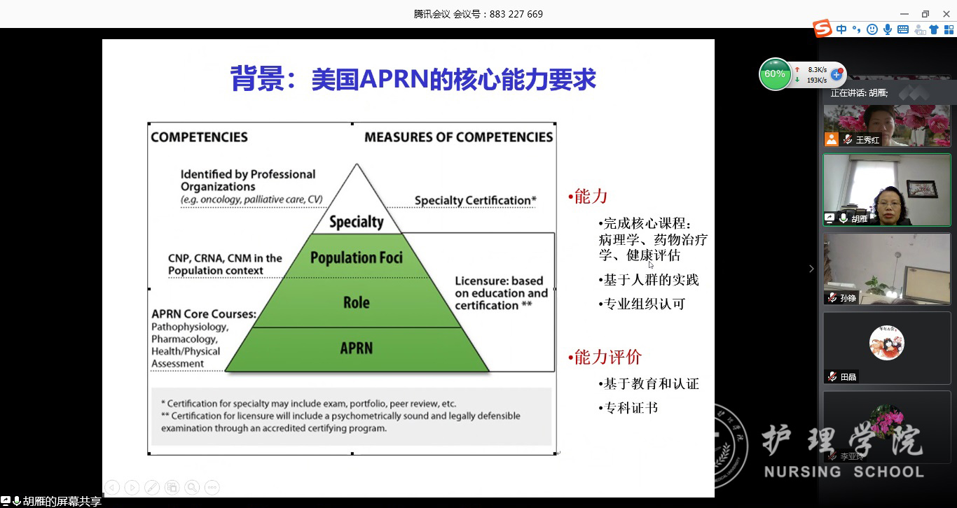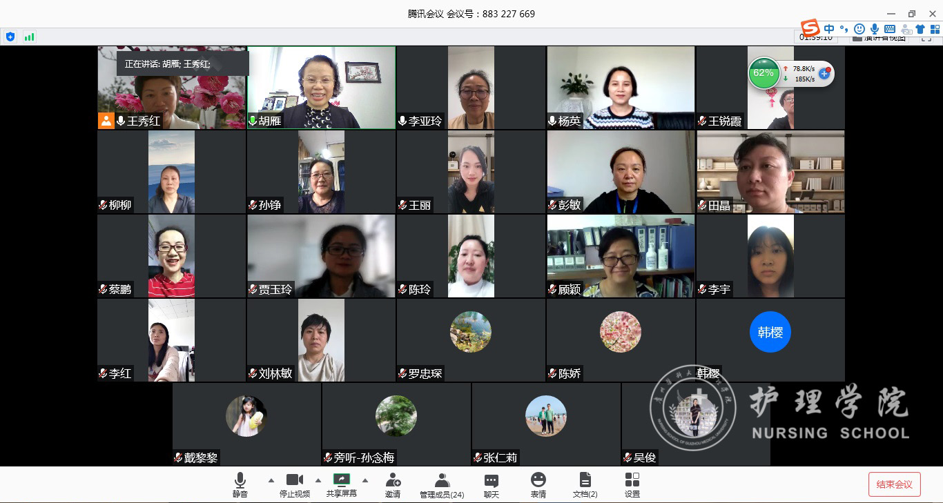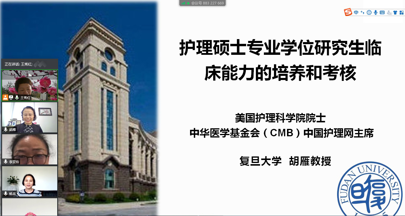 6月12日上午,复旦大学美加墨世界杯官方网站院长胡雁教授受邀为美加墨世界杯官方网站全体研究生导师和专业教师开展了题为《护理硕士专业学位研究生临床能力的培养及考核》专题讲座。会议通过腾讯会议平台进行,美加墨世界杯官方网站相关导师和教师近30人参加讲座,美加墨世界杯官方网站党委书记杨英主持。